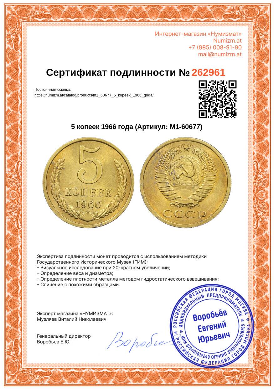 20.01.2025Интернет магазин «Нумизмат» предлагает приобрести 5 копеек 1966 года.