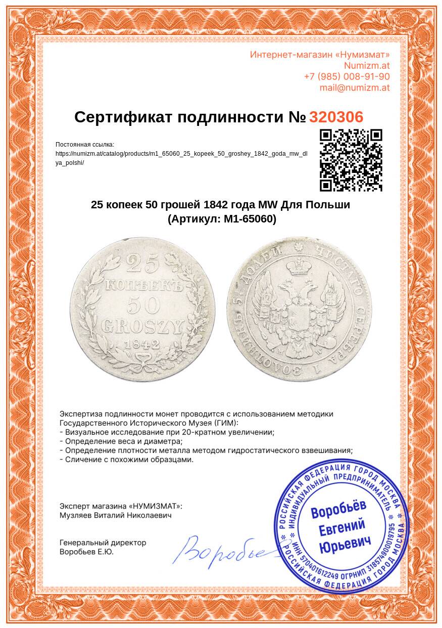 20.01.2025Интернет магазин «Нумизмат» предлагает приобрести 25 копеек 50 грошей 1842 года MW Для Польши.