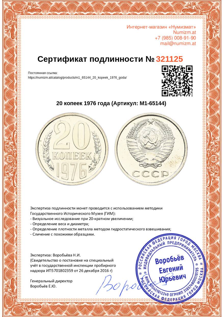 Монета 20 копеек 1976 года (Артикул: M1-65144): подробные характеристики, качественные фотографии в высоком разрешении, низкая цена.