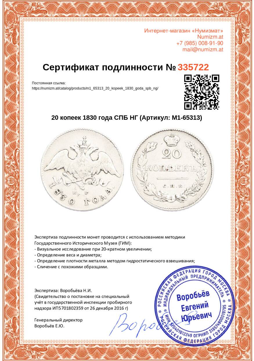 20.01.2025Интернет магазин «Нумизмат» предлагает приобрести 20 копеек 1830 года СПБ НГ.