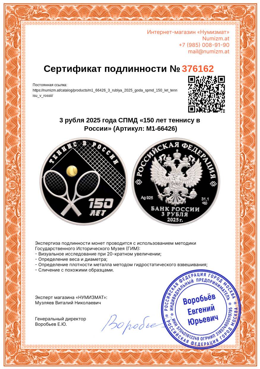 20.01.2025Интернет магазин «Нумизмат» предлагает приобрести 3 рубля 2025 года СПМД «150 лет теннису в России».