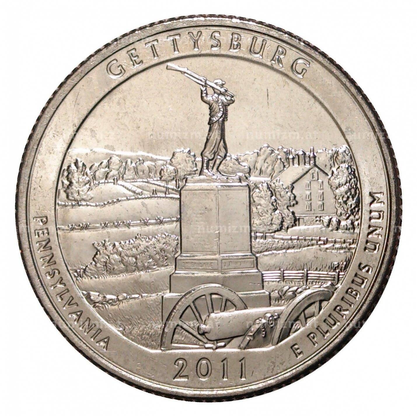 Купить 25 центов (1/4 доллара) 2011 года P США «Национальные парки — №6 Национальный парк Геттисберг» по привлекательной цене можно в нашем интернет-магазине — Вам достаточно оформить заказ на сайте. Все монеты, представленные в каталоге, находятся в наличии на нашем складе.