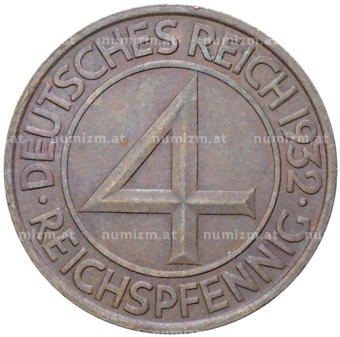 Монета 4 рейхспфеннига 1932 года А Германия (Артикул: M2-59397): подробные характеристики, качественные фотографии в высоком разрешении, низкая цена.