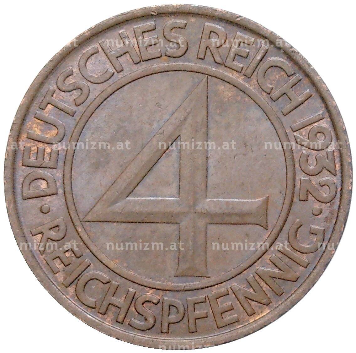 Монета 4 рейхспфеннига 1932 года А Германия (Артикул: M2-59403): подробные характеристики, качественные фотографии в высоком разрешении, низкая цена.