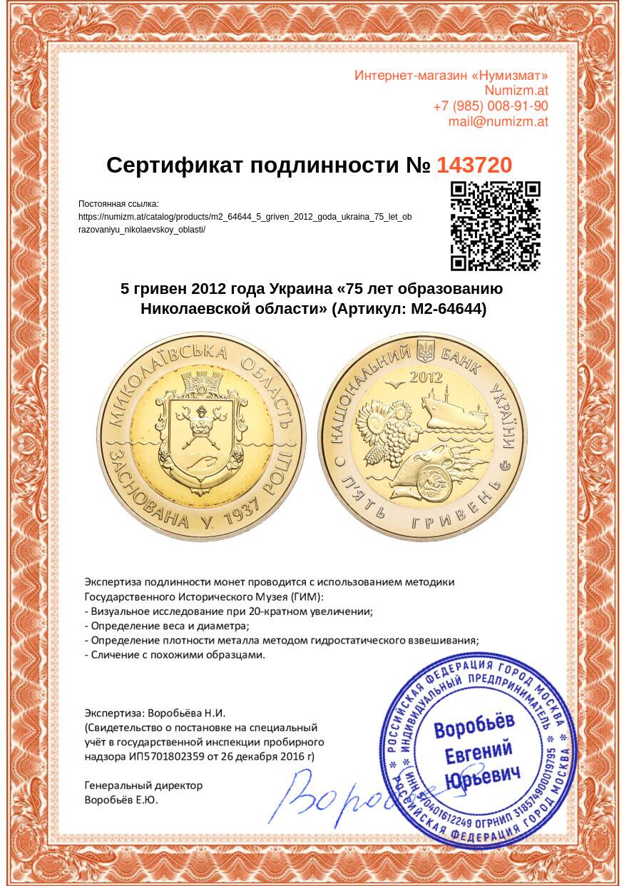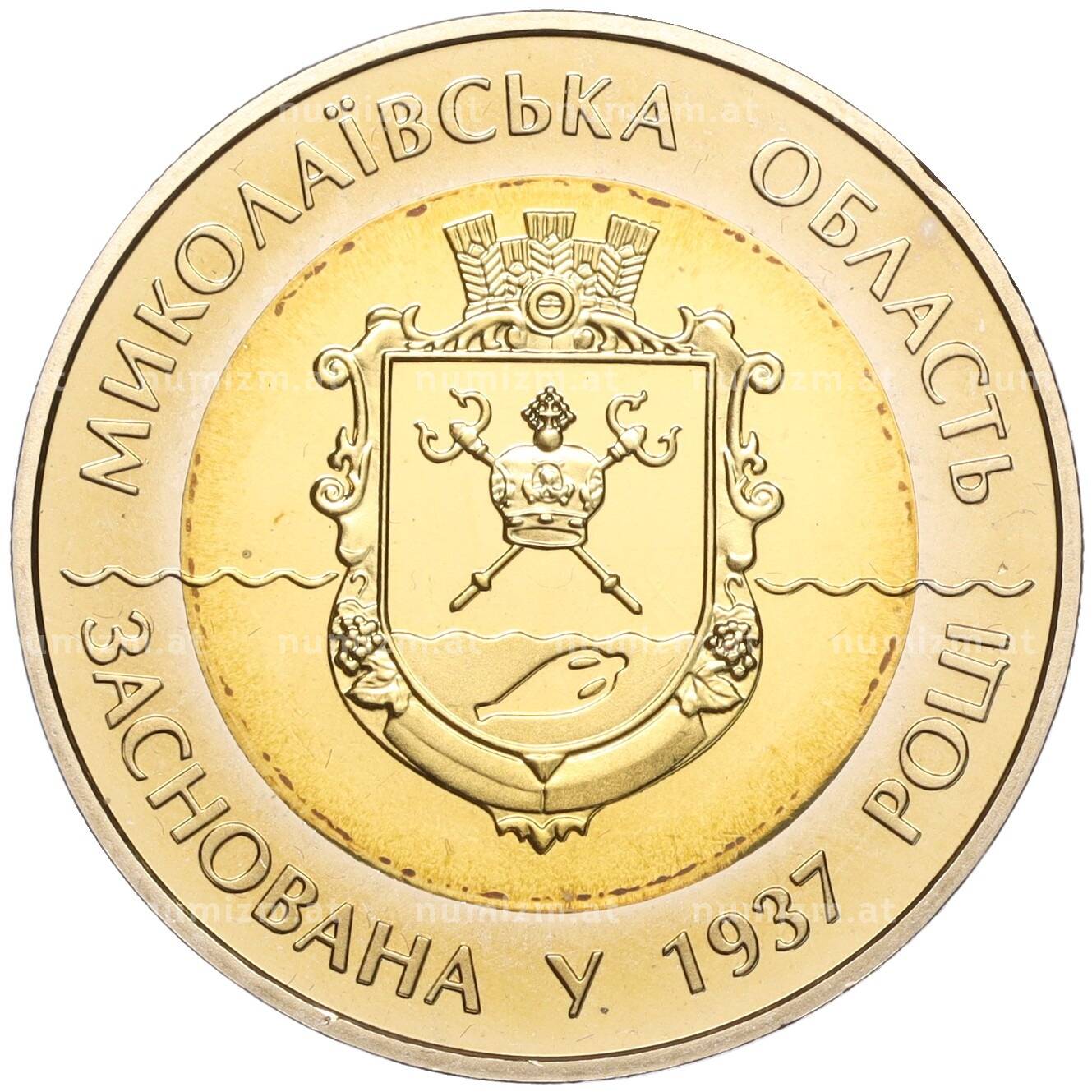 20.01.2025Интернет магазин «Нумизмат» предлагает приобрести 5 гривен 2012 года Украина «75 лет образованию Николаевской области».