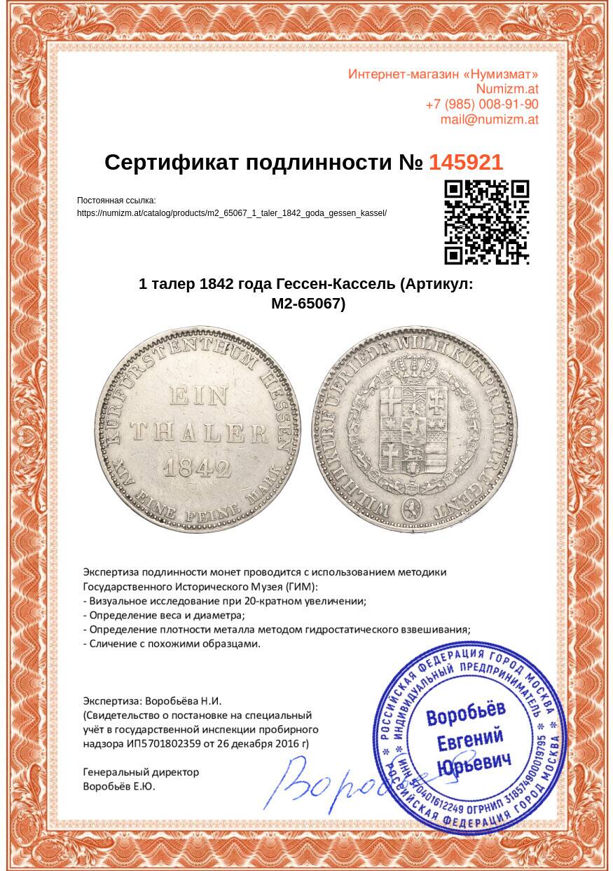 20.01.2025Интернет магазин «Нумизмат» предлагает приобрести 1 талер 1842 года Гессен-Кассель.