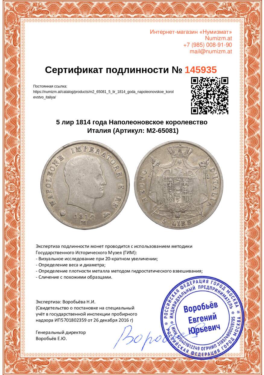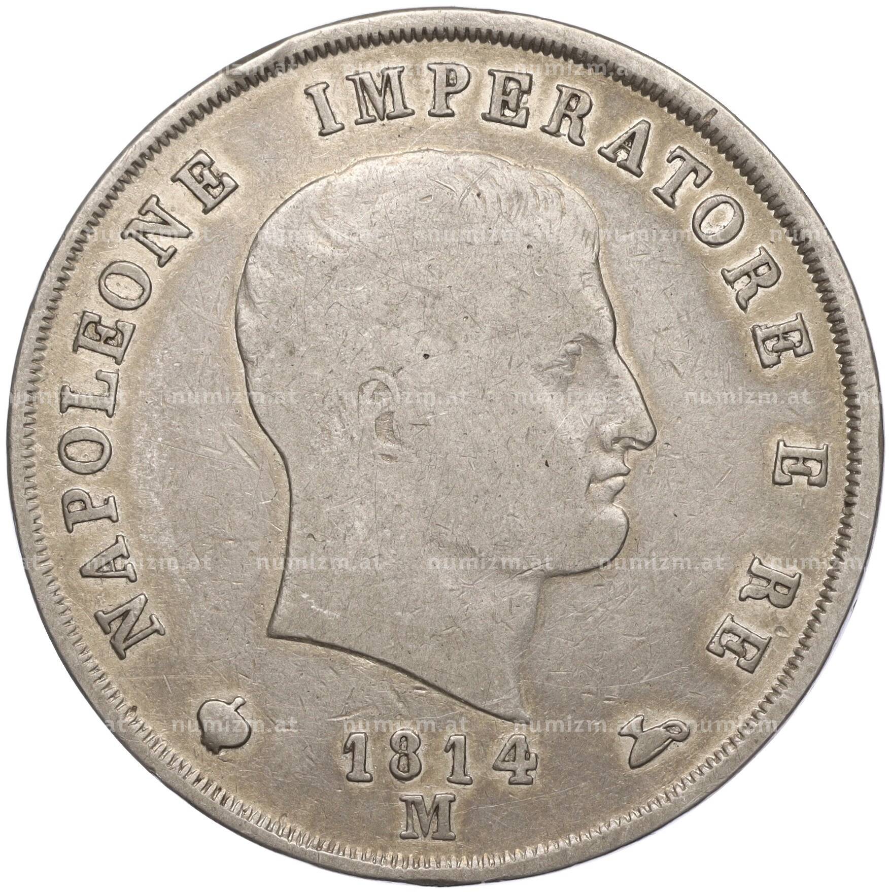Купить 5 лир 1814 года Наполеоновское королевство Италия по привлекательной цене можно в нашем интернет-магазине — Вам достаточно оформить заказ на сайте. Все монеты, представленные в каталоге, находятся в наличии на нашем складе.