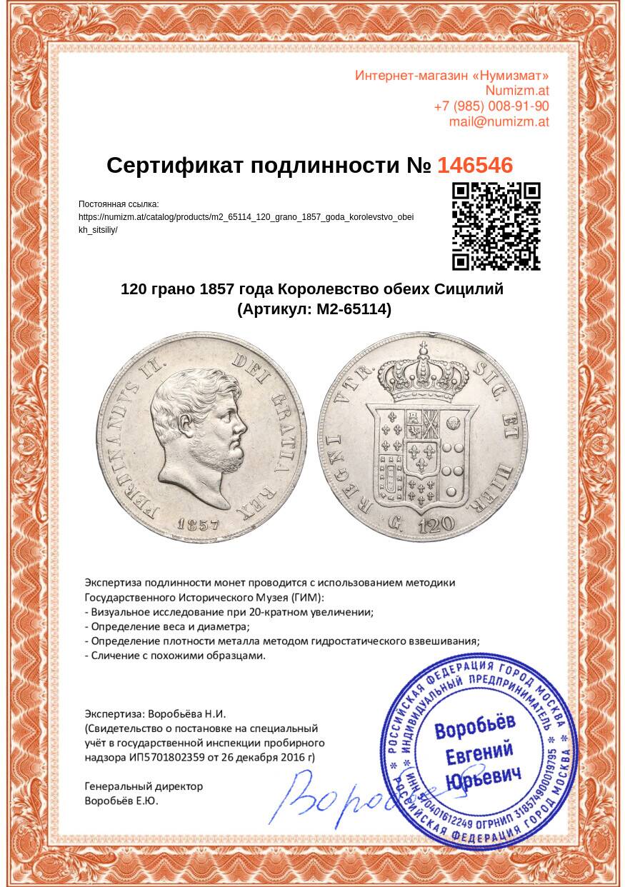 20.01.2025Интернет магазин «Нумизмат» предлагает приобрести 120 грано 1857 года Королевство обеих Сицилий.