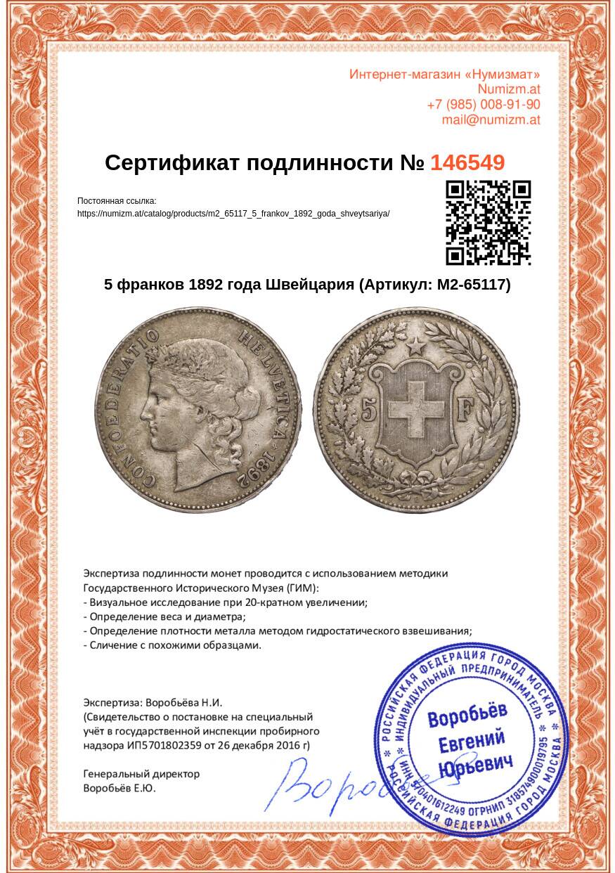 20.01.2025Интернет магазин «Нумизмат» предлагает приобрести 5 франков 1892 года Швейцария.