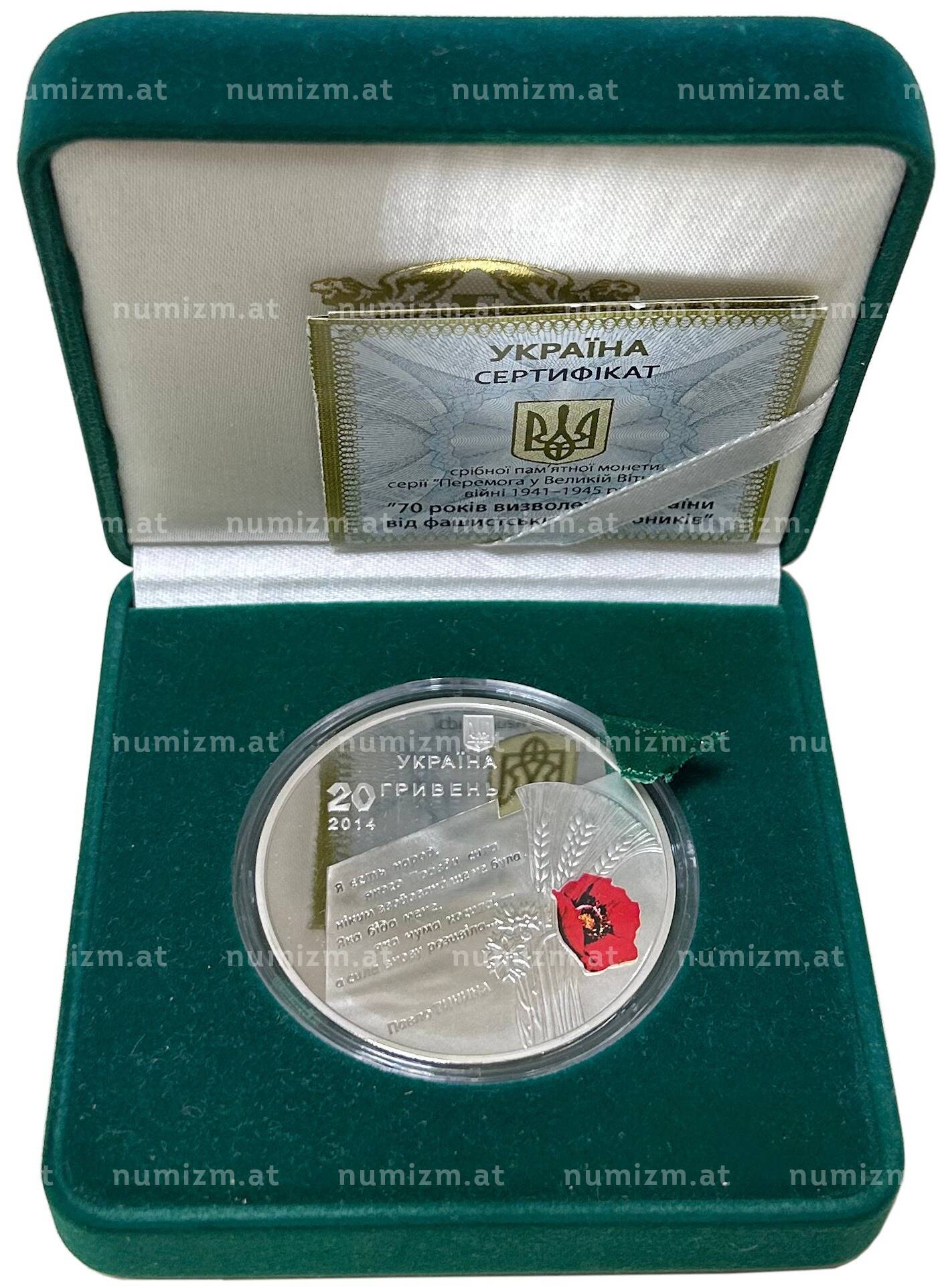 Купить 20 гривен 2014 года Украина «70 лет освобождению Украины» по привлекательной цене можно в нашем интернет-магазине — Вам достаточно оформить заказ на сайте. Все монеты, представленные в каталоге, находятся в наличии на нашем складе.