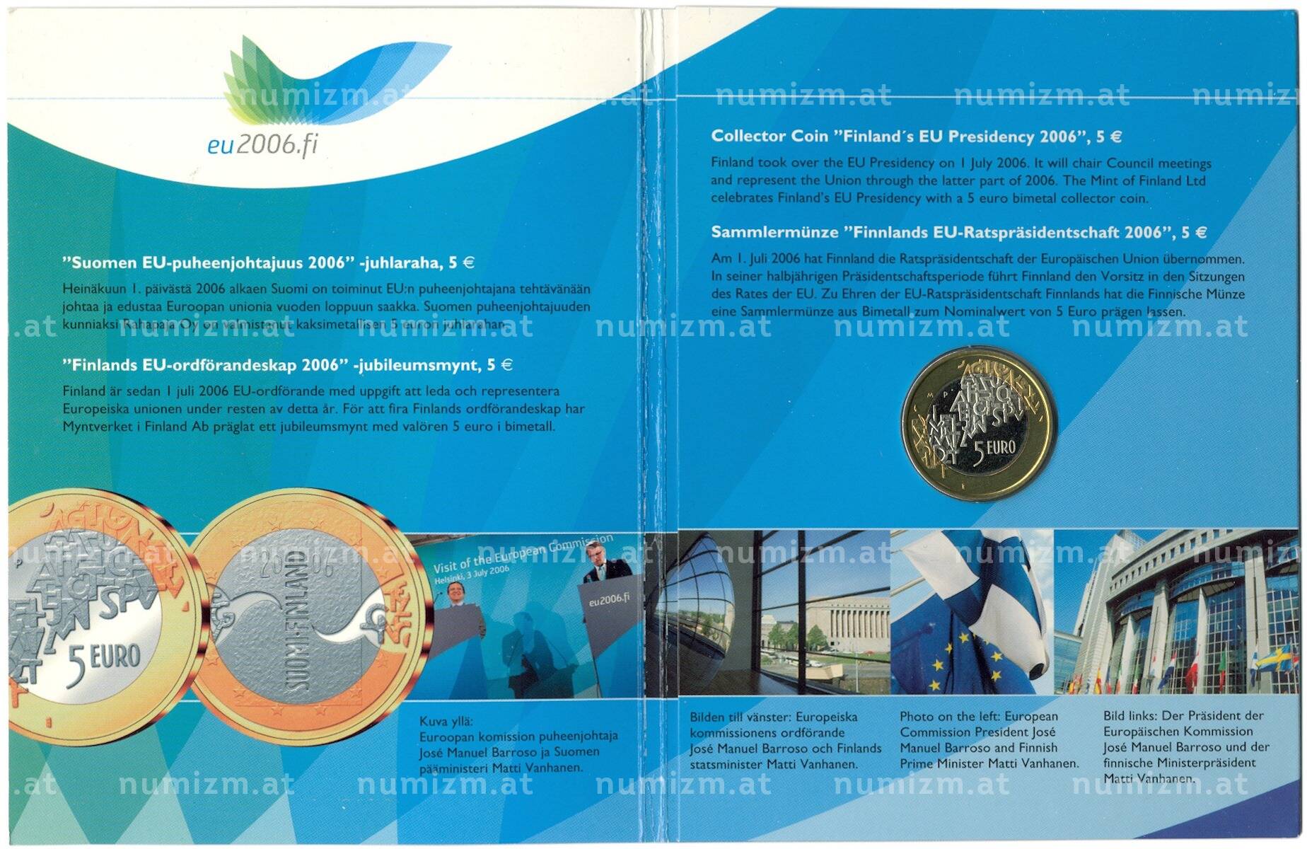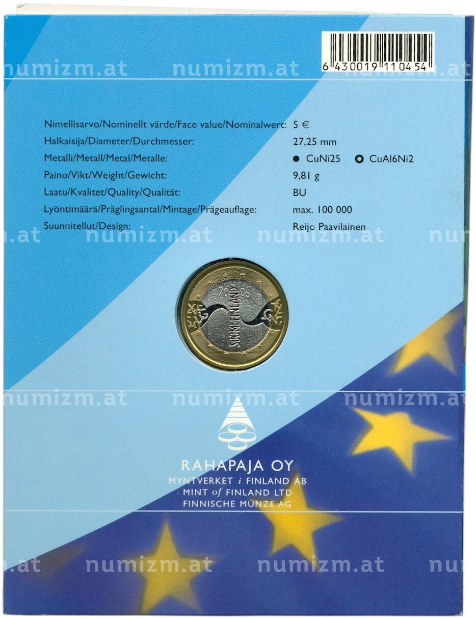 20.01.2025Интернет магазин «Нумизмат» предлагает приобрести 5 евро 2006 года Финляндия «Председательство Финляндии в ЕС» (в буклете).