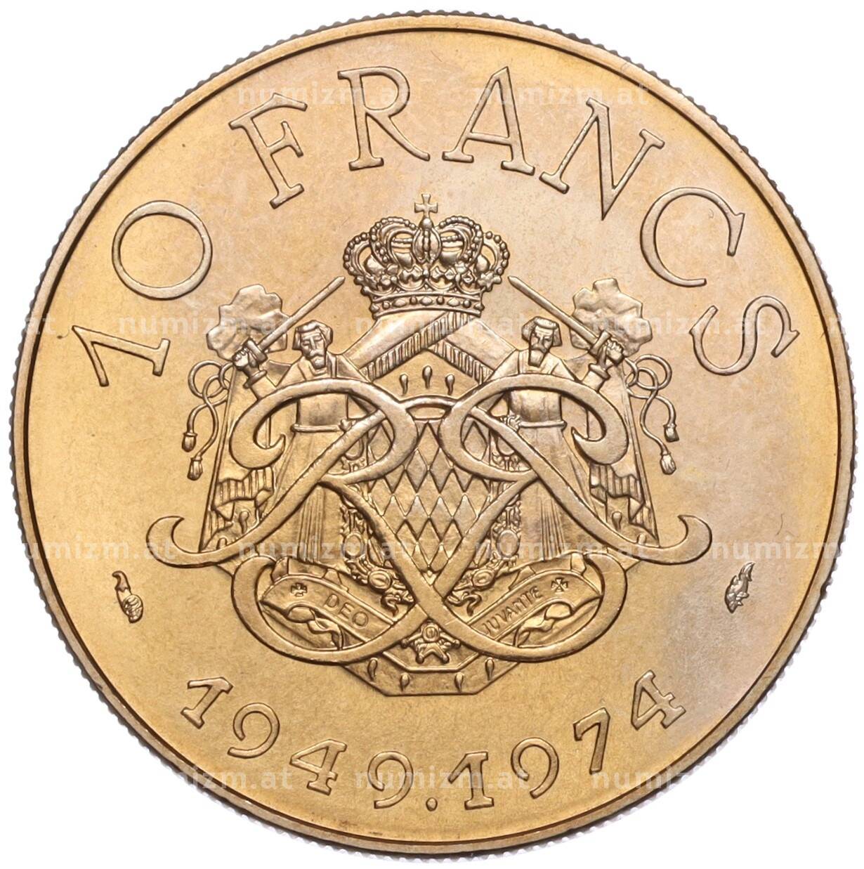 Купить 10 франков 1974 года Монако «25 лет правления Ренье III» по привлекательной цене можно в нашем интернет-магазине — Вам достаточно оформить заказ на сайте. Все монеты, представленные в каталоге, находятся в наличии на нашем складе.