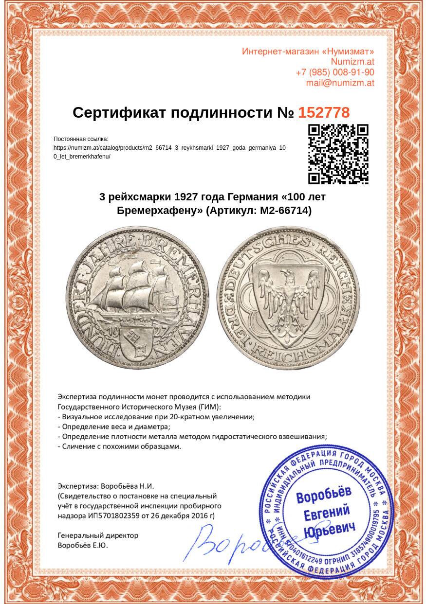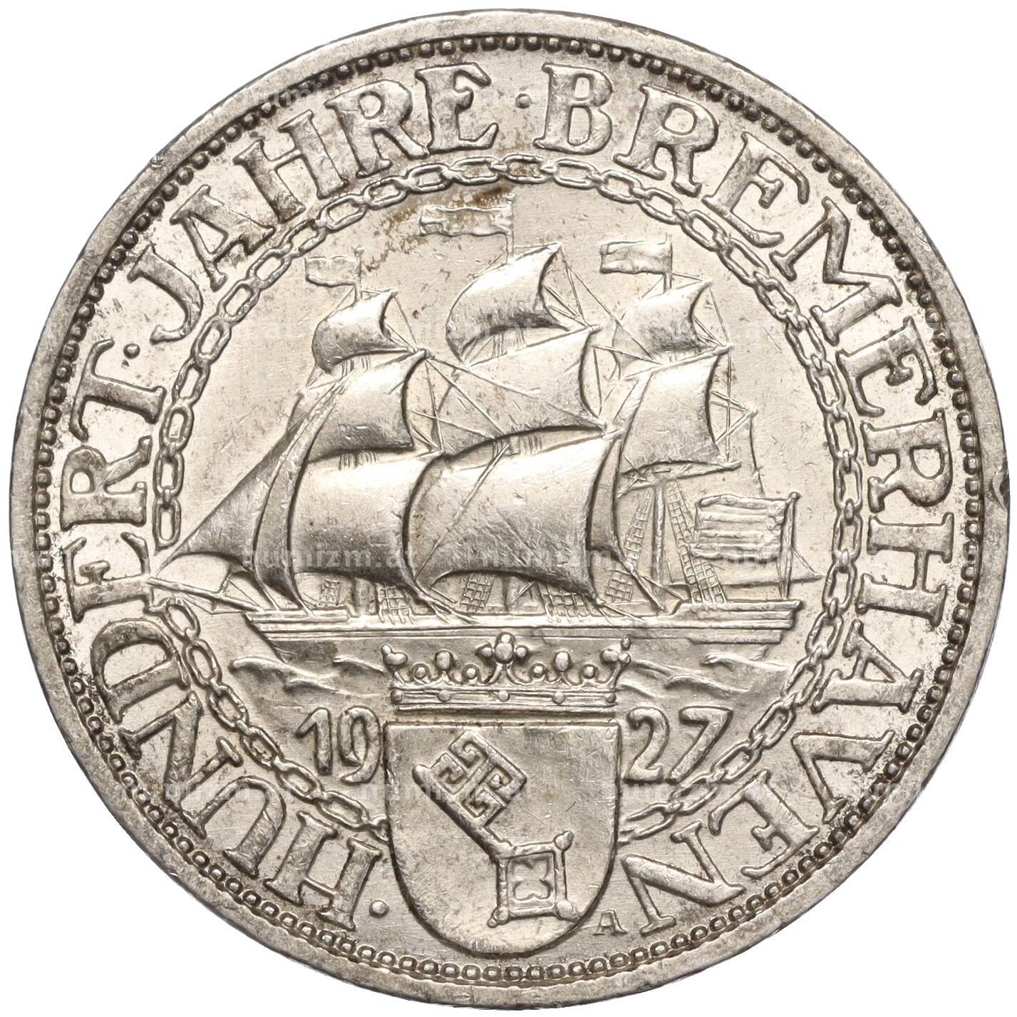 Купить 3 рейхсмарки 1927 года Германия «100 лет Бремерхафену» по привлекательной цене можно в нашем интернет-магазине — Вам достаточно оформить заказ на сайте. Все монеты, представленные в каталоге, находятся в наличии на нашем складе.