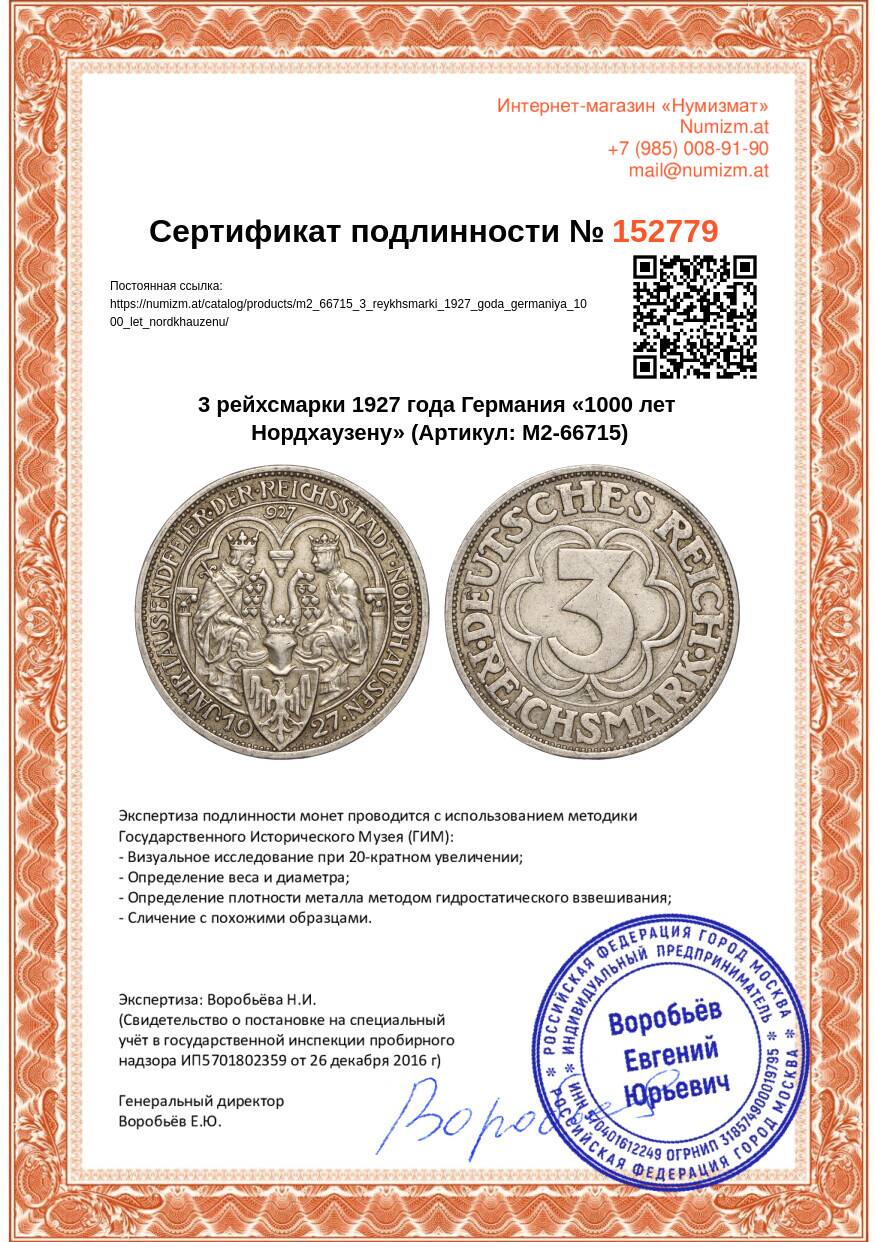 Купить 3 рейхсмарки 1927 года Германия «1000 лет Нордхаузену» по привлекательной цене можно в нашем интернет-магазине — Вам достаточно оформить заказ на сайте. Все монеты, представленные в каталоге, находятся в наличии на нашем складе.