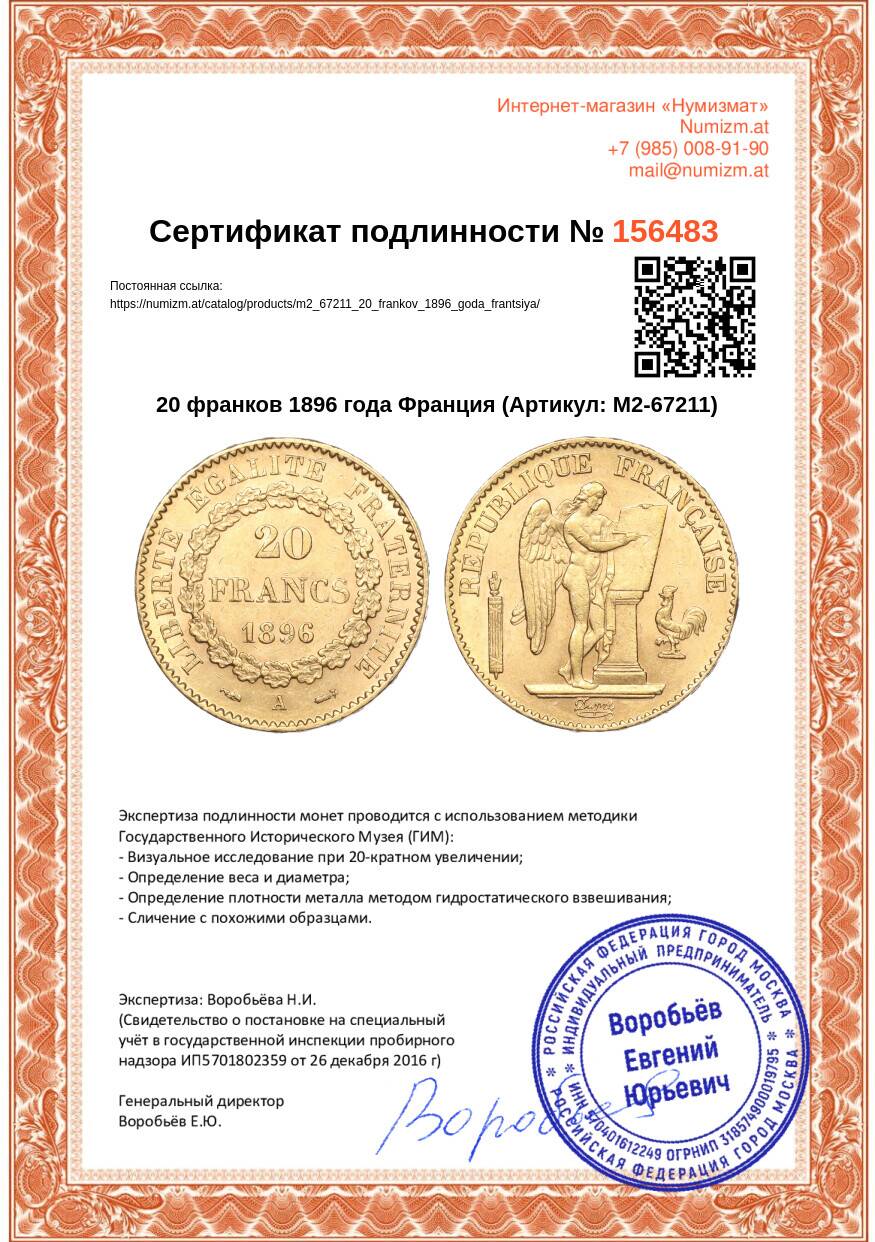 Купить 20 франков 1896 года Франция по привлекательной цене можно в нашем интернет-магазине — Вам достаточно оформить заказ на сайте. Все монеты, представленные в каталоге, находятся в наличии на нашем складе.