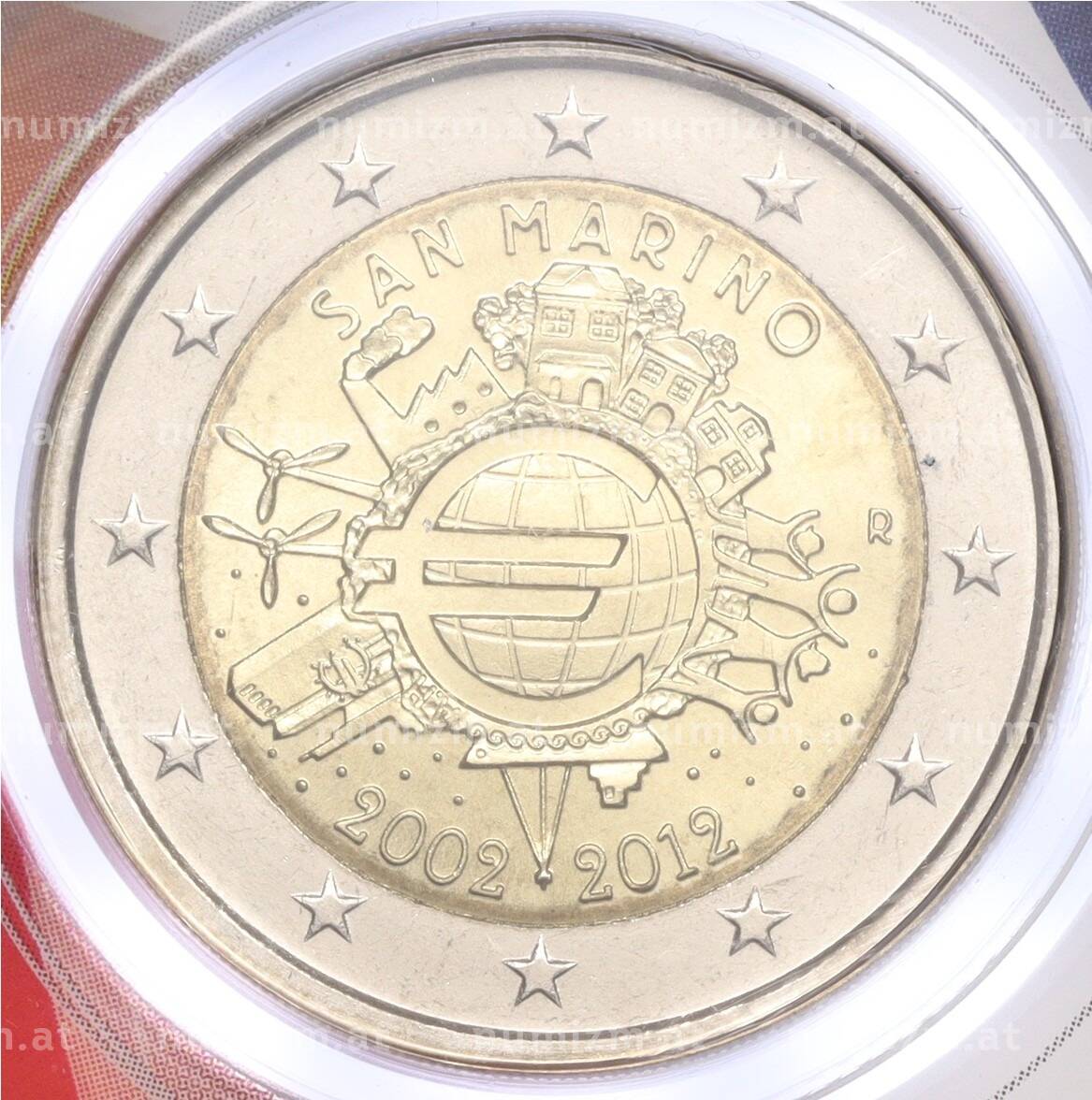 Купить 2 евро 2012 года Сан-Марино «10 лет евро наличными» (в буклете) по привлекательной цене можно в нашем интернет-магазине — Вам достаточно оформить заказ на сайте. Все монеты, представленные в каталоге, находятся в наличии на нашем складе.