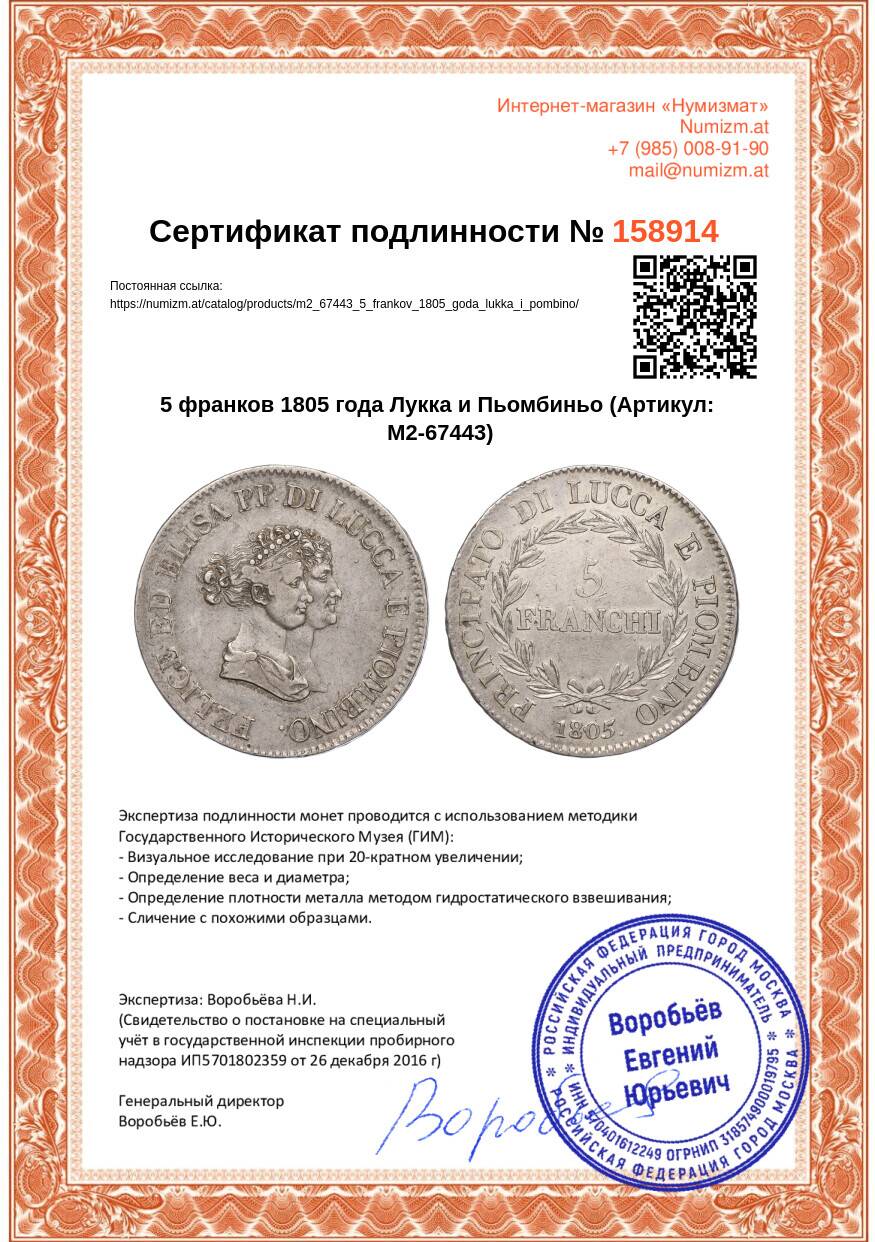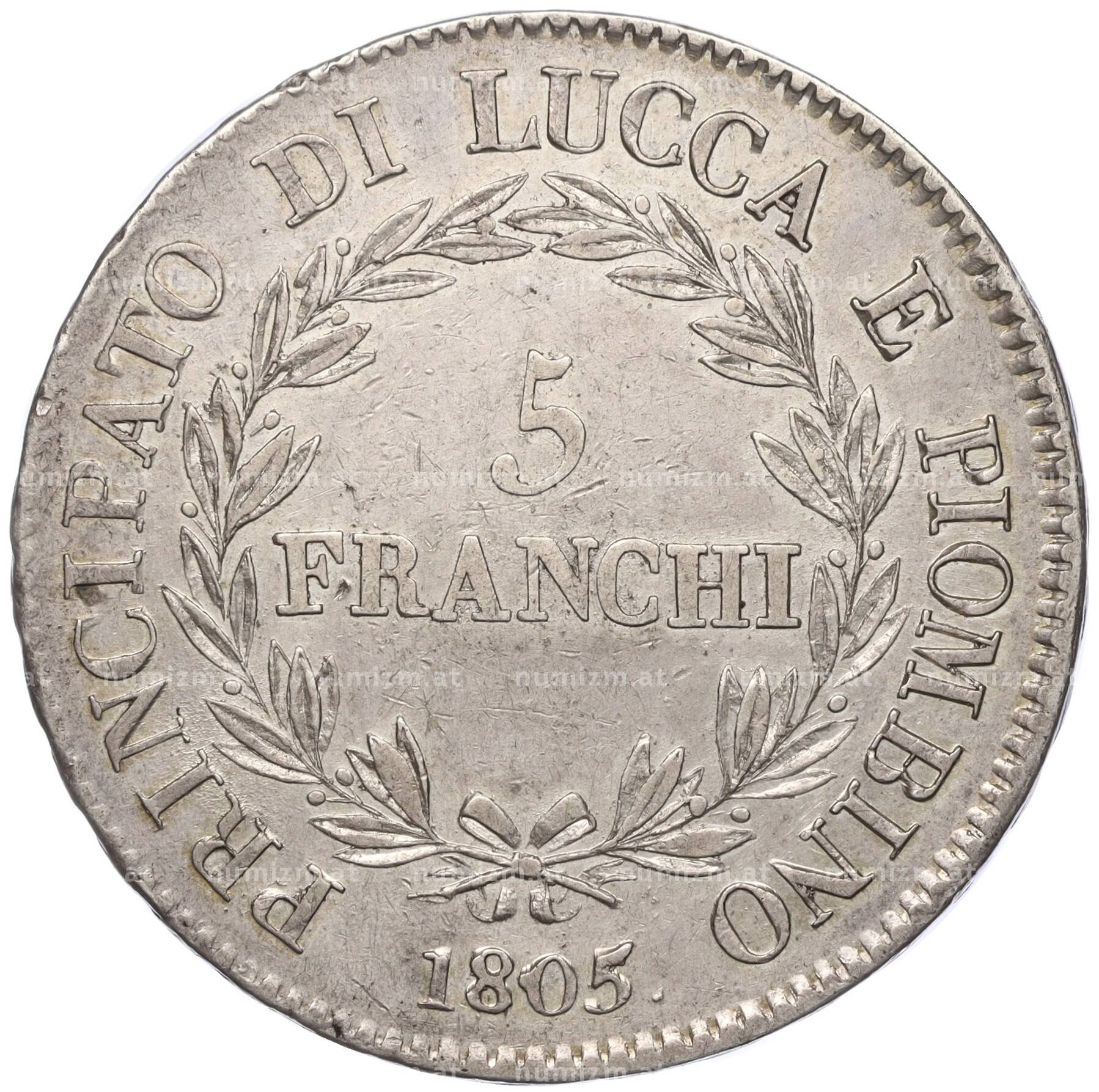 Купить 5 франков 1805 года Лукка и Пьомбиньо по привлекательной цене можно в нашем интернет-магазине — Вам достаточно оформить заказ на сайте. Все монеты, представленные в каталоге, находятся в наличии на нашем складе.
