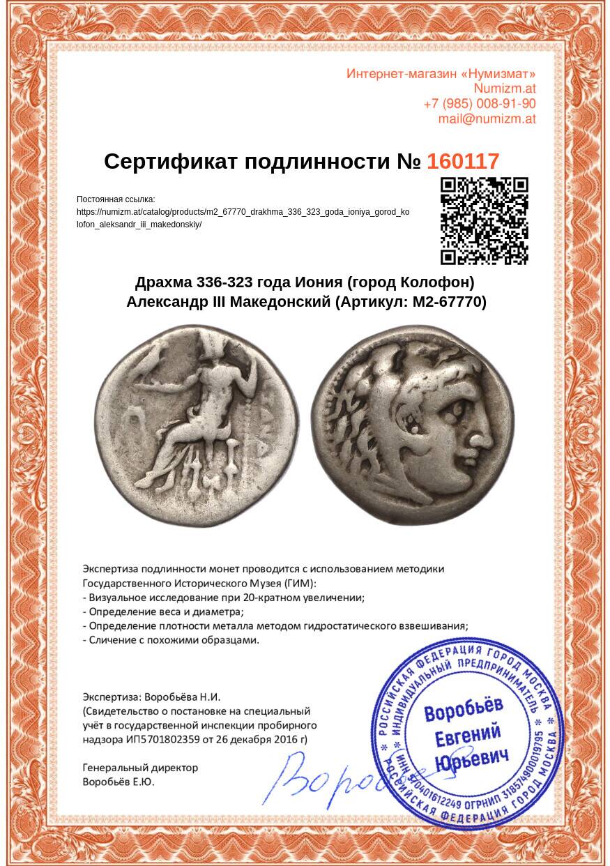 Купить Драхма 336-323 года Иония (город Колофон) Александр III Македонский по привлекательной цене можно в нашем интернет-магазине — Вам достаточно оформить заказ на сайте. Все монеты, представленные в каталоге, находятся в наличии на нашем складе.