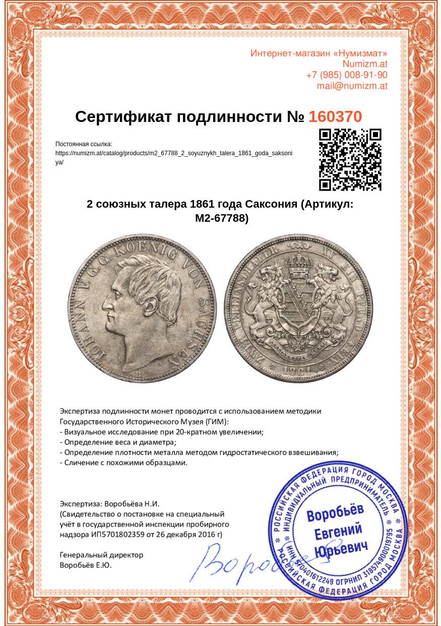 20.01.2025Интернет магазин «Нумизмат» предлагает приобрести 2 союзных талера 1861 года Саксония.