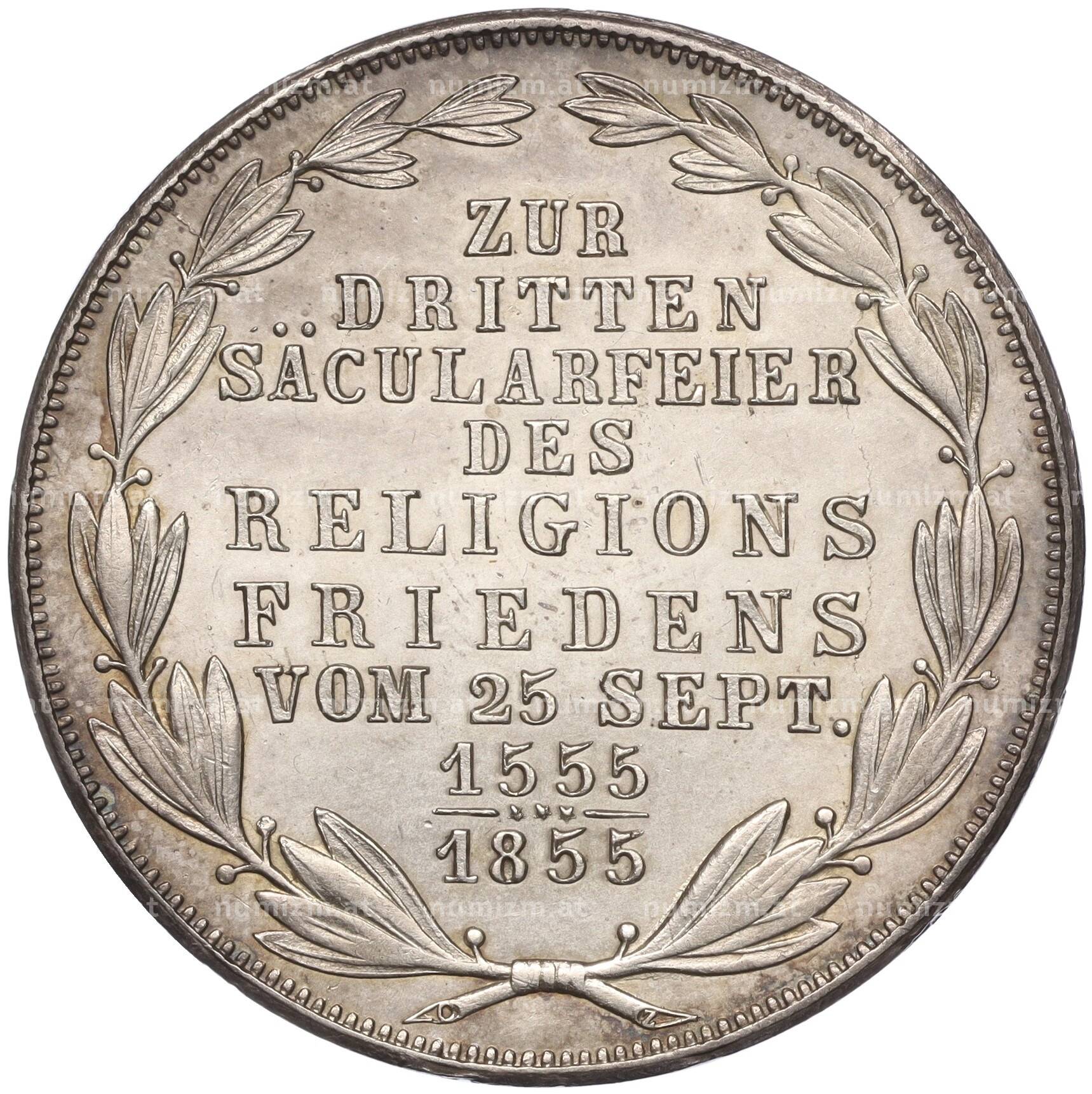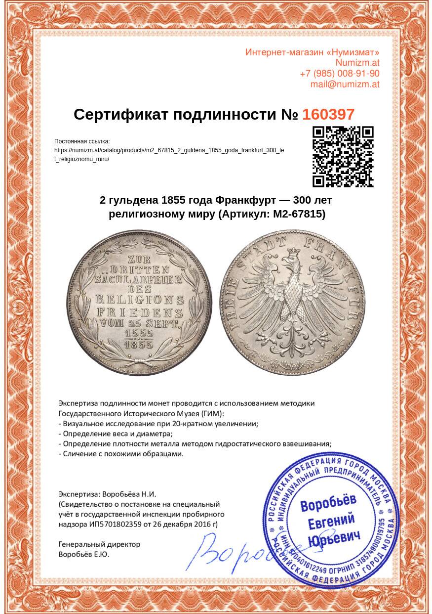 Купить 2 гульдена 1855 года Франкфурт — 300 лет религиозному миру по привлекательной цене можно в нашем интернет-магазине — Вам достаточно оформить заказ на сайте. Все монеты, представленные в каталоге, находятся в наличии на нашем складе.