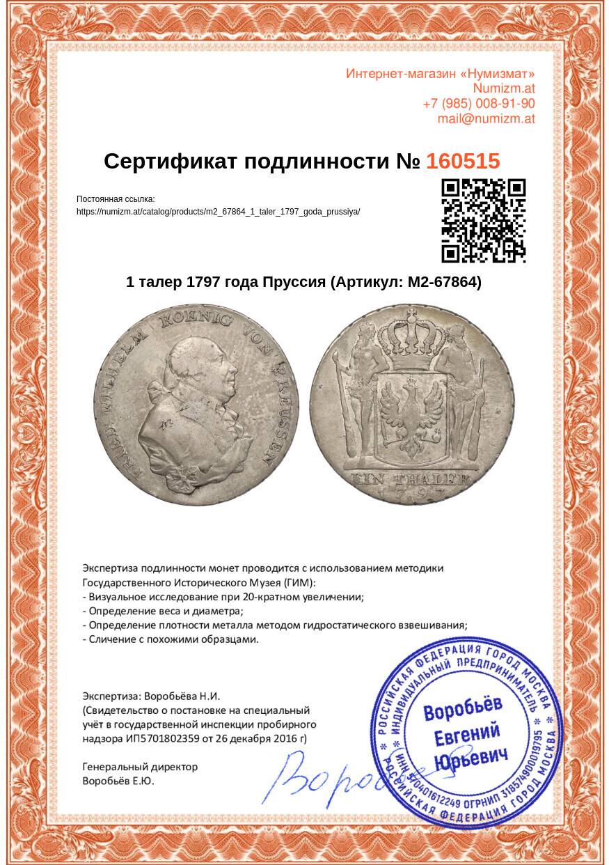 20.01.2025Интернет магазин «Нумизмат» предлагает приобрести 1 талер 1797 года Пруссия.