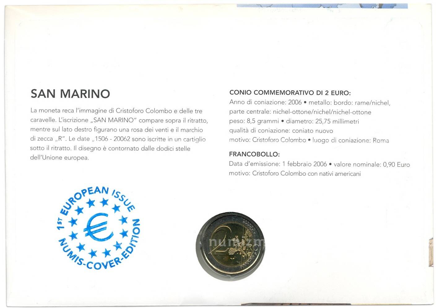 20.01.2025Интернет магазин «Нумизмат» предлагает приобрести 2 евро 2006 года Сан-Марино «500 лет со дня смерти Христофора Колумба» (в конверте).