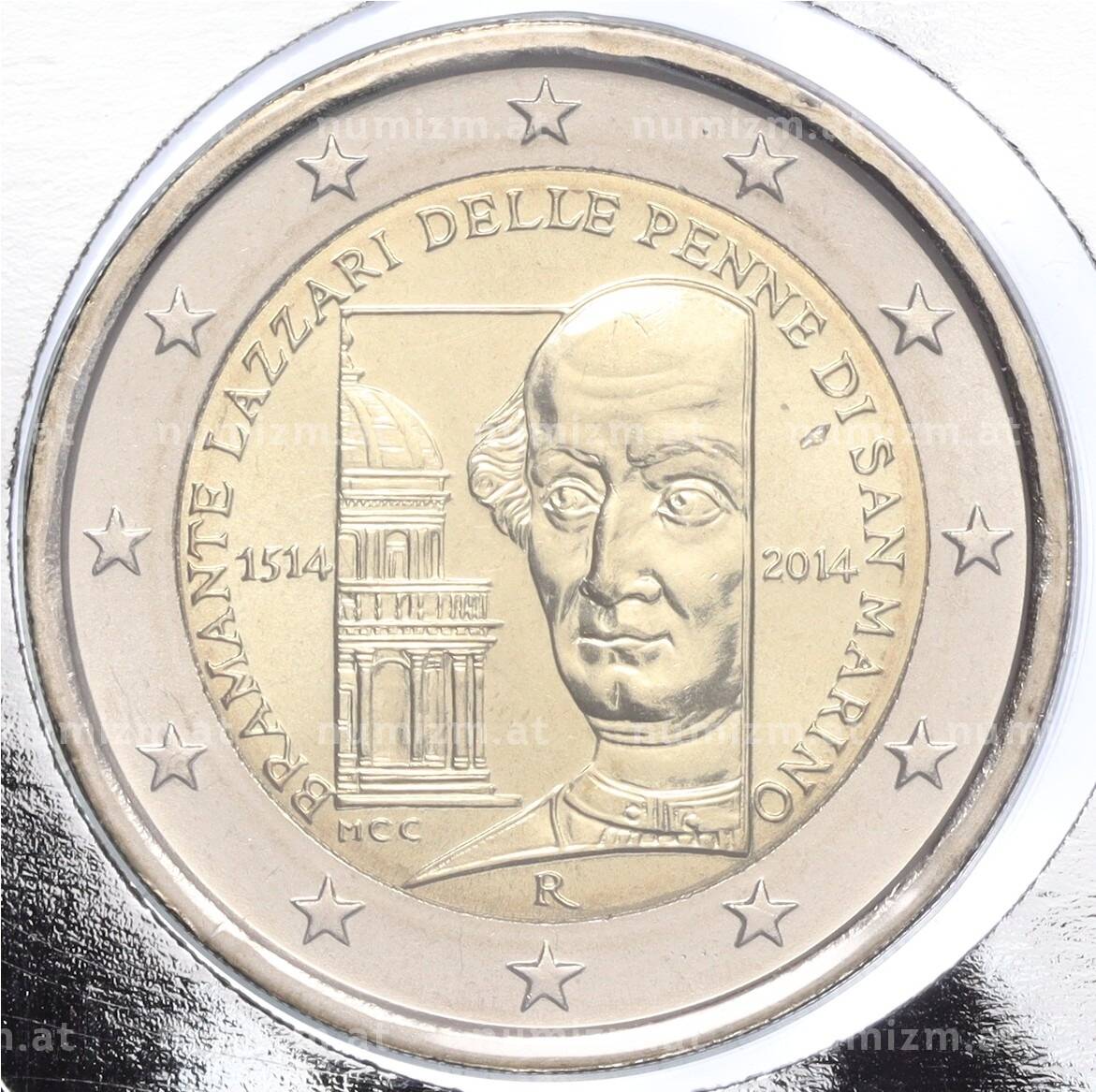 Купить 2 евро 2014 года Сан-Марино «500 лет со дня смерти Донато Браманте» (в конверте) по привлекательной цене можно в нашем интернет-магазине — Вам достаточно оформить заказ на сайте. Все монеты, представленные в каталоге, находятся в наличии на нашем складе.