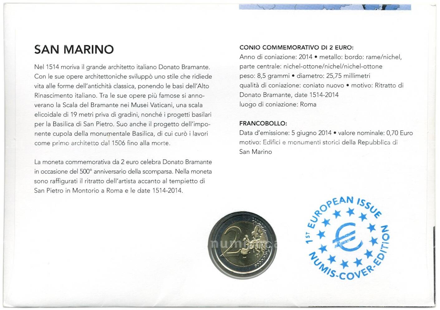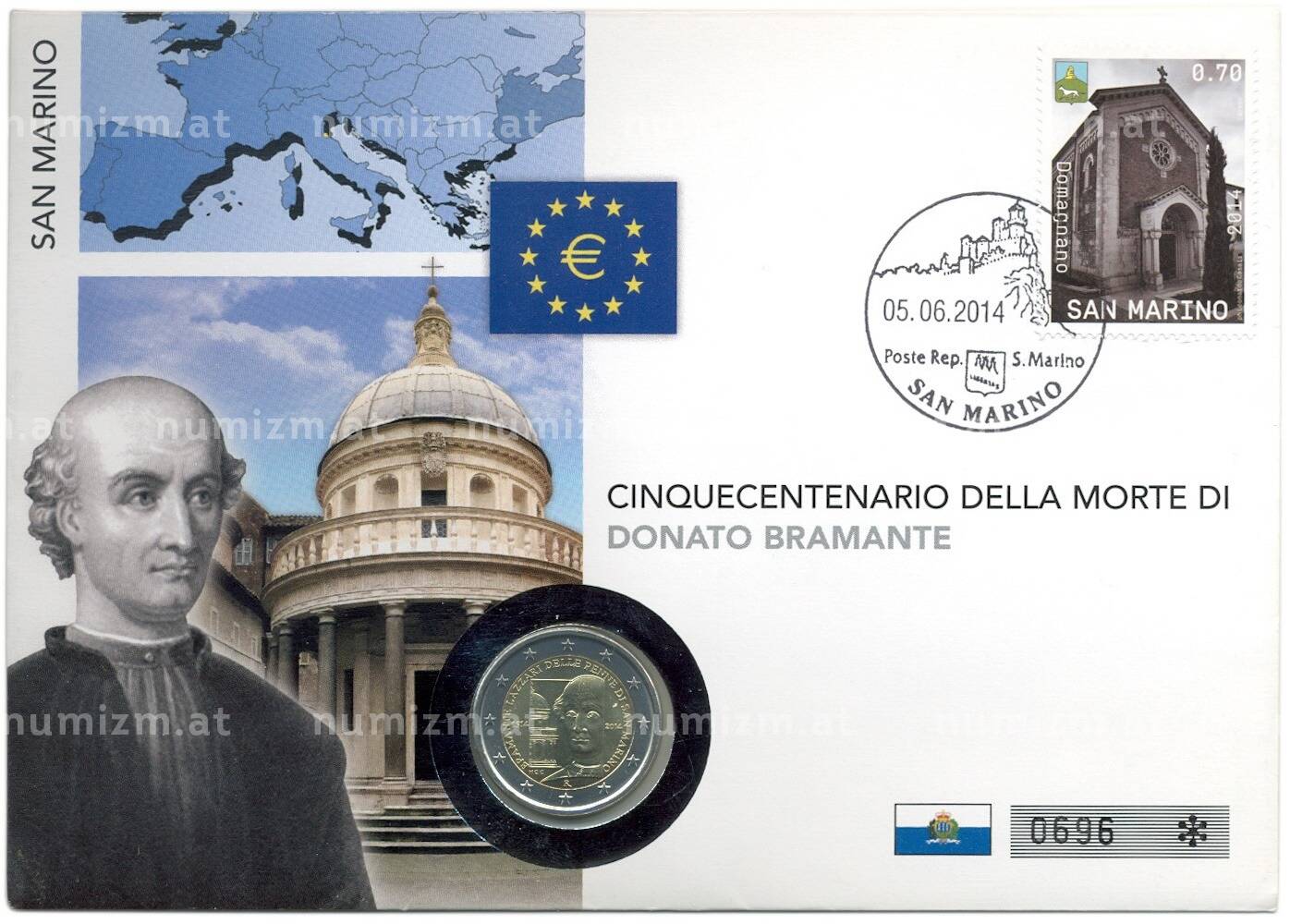 20.01.2025Интернет магазин «Нумизмат» предлагает приобрести 2 евро 2014 года Сан-Марино «500 лет со дня смерти Донато Браманте» (в конверте).