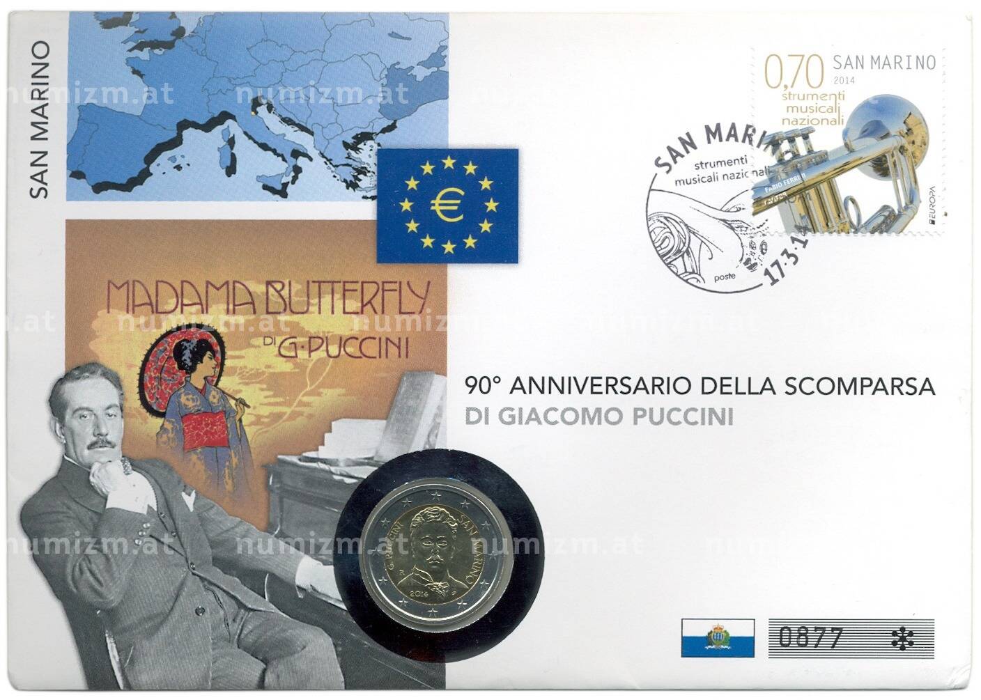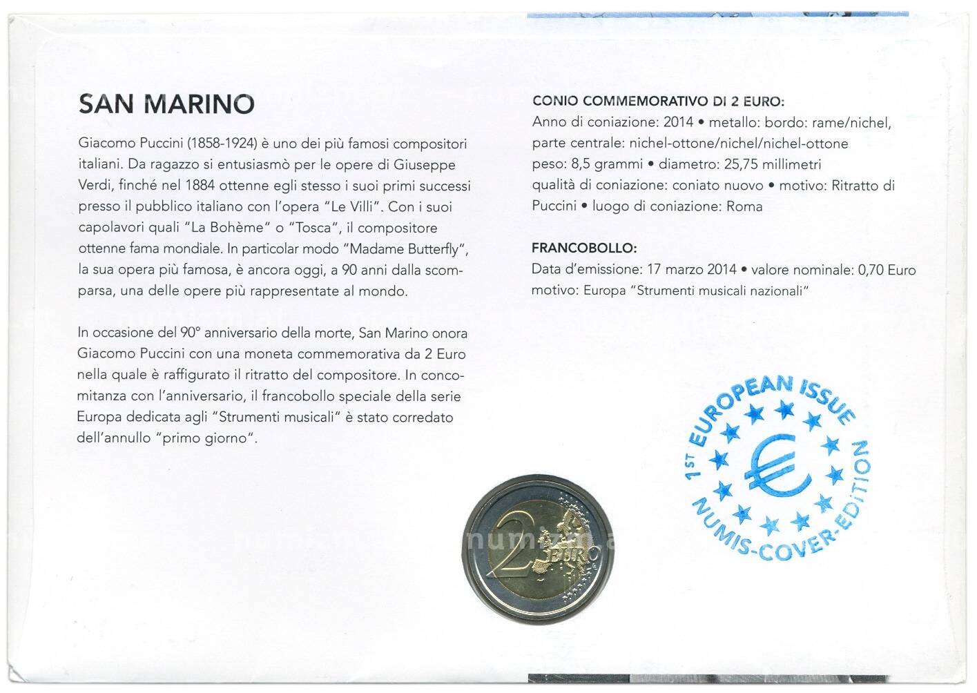 20.01.2025Интернет магазин «Нумизмат» предлагает приобрести 2 евро 2014 года Сан-Марино «90 лет со дня смерти Джакомо Пуччини» (в конверте).