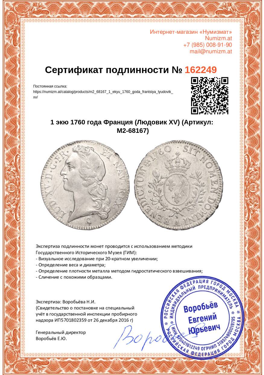 20.01.2025Интернет магазин «Нумизмат» предлагает приобрести 1 экю 1760 года Франция (Людовик XV).