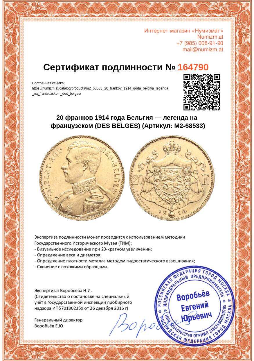 20.01.2025Интернет магазин «Нумизмат» предлагает приобрести 20 франков 1914 года Бельгия — легенда на французском (DES BELGES).