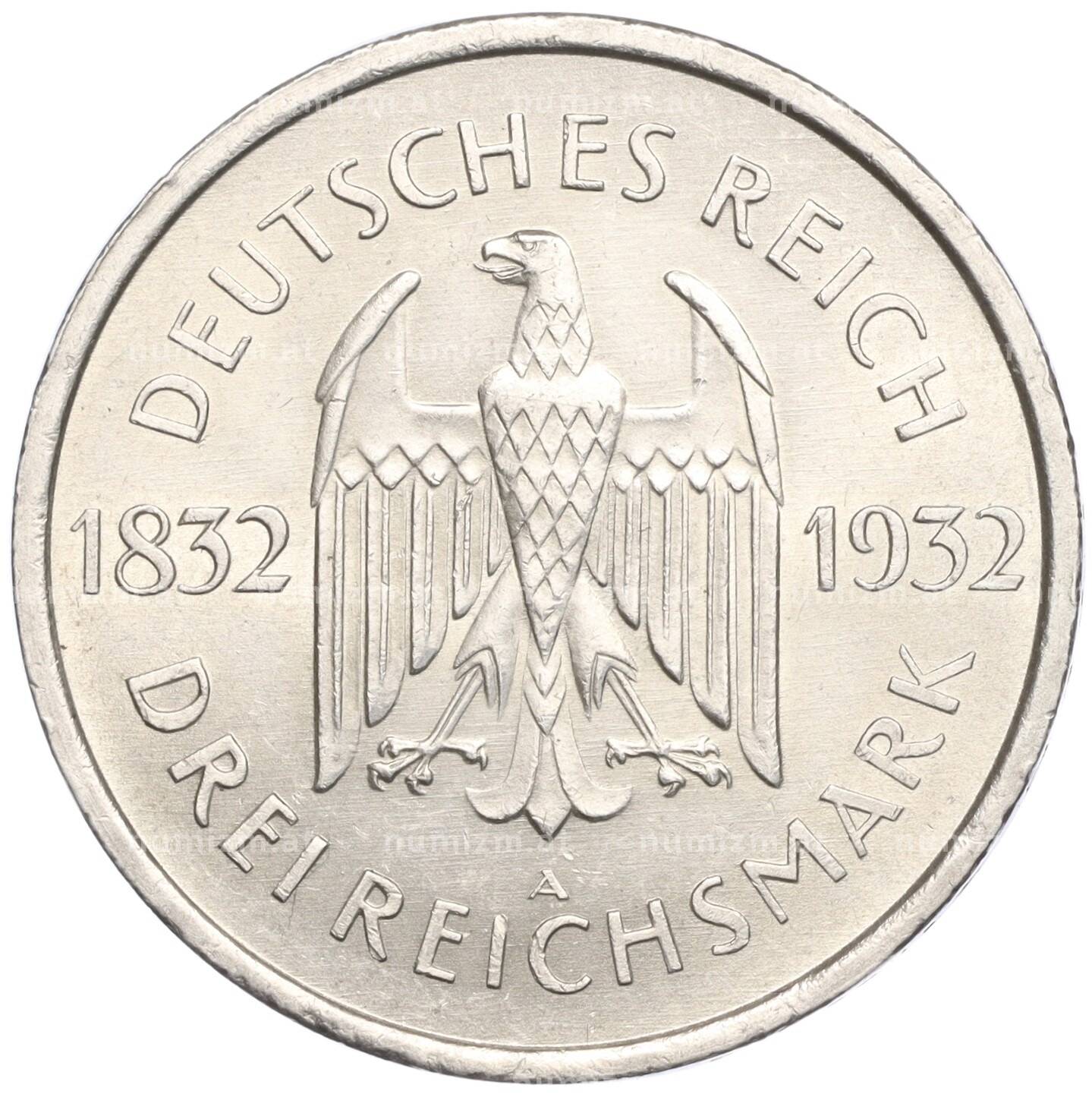Купить 3 рейхсмарки 1932 года A Германия «100 лет со дня смерти Гете» по привлекательной цене можно в нашем интернет-магазине — Вам достаточно оформить заказ на сайте. Все монеты, представленные в каталоге, находятся в наличии на нашем складе.