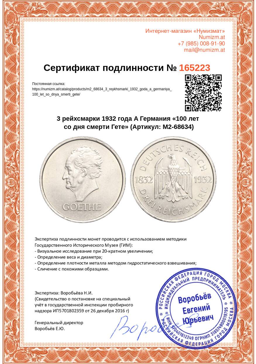 20.01.2025Интернет магазин «Нумизмат» предлагает приобрести 3 рейхсмарки 1932 года A Германия «100 лет со дня смерти Гете».