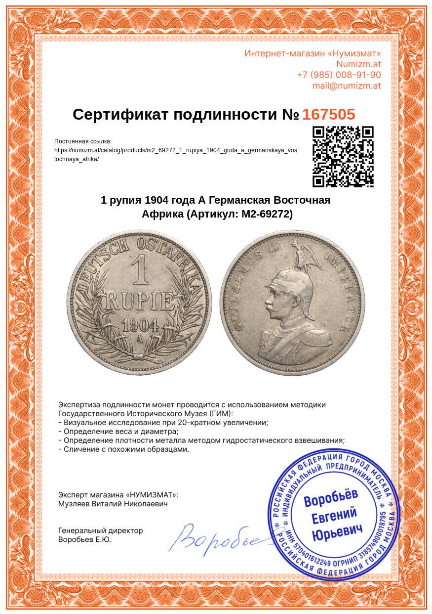 20.01.2025Интернет магазин «Нумизмат» предлагает приобрести 1 рупия 1904 года А Германская Восточная Африка.
