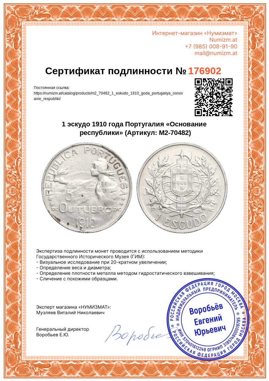 Монета 1 эскудо 1910 года Португалия «Основание республики» (Артикул: M2-70482): подробные характеристики, качественные фотографии в высоком разрешении, низкая цена.