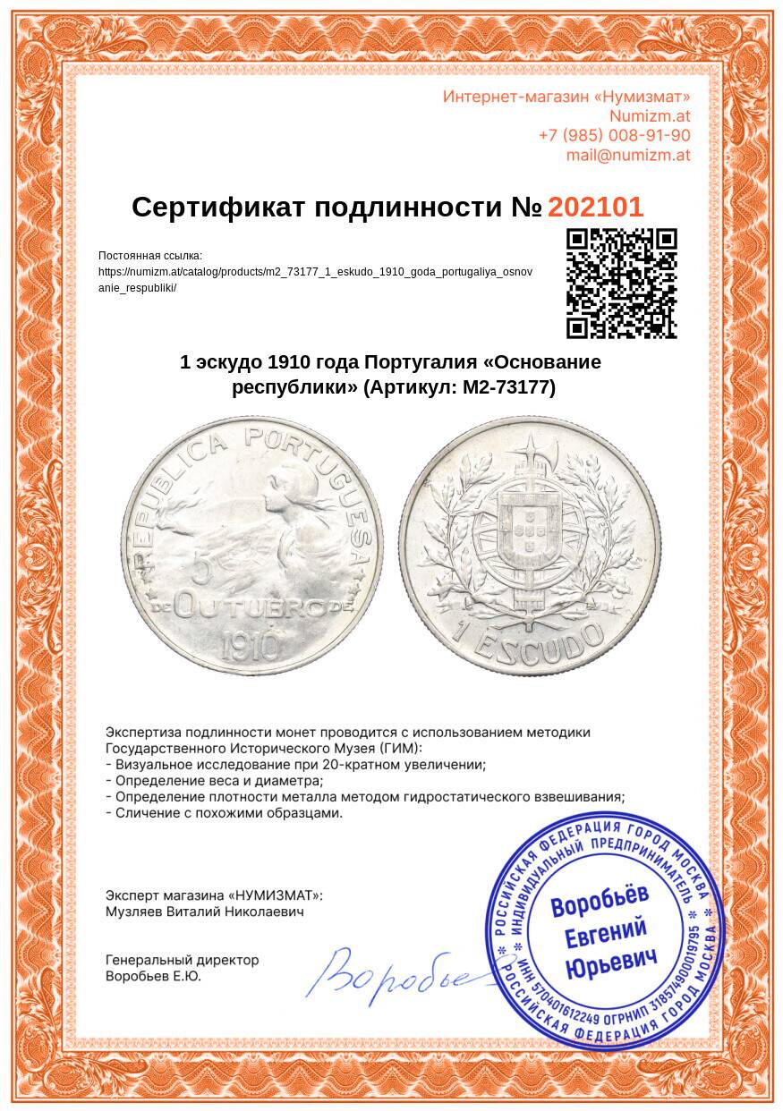 Монета 1 эскудо 1910 года Португалия «Основание республики» (Артикул: M2-73177): подробные характеристики, качественные фотографии в высоком разрешении, низкая цена.