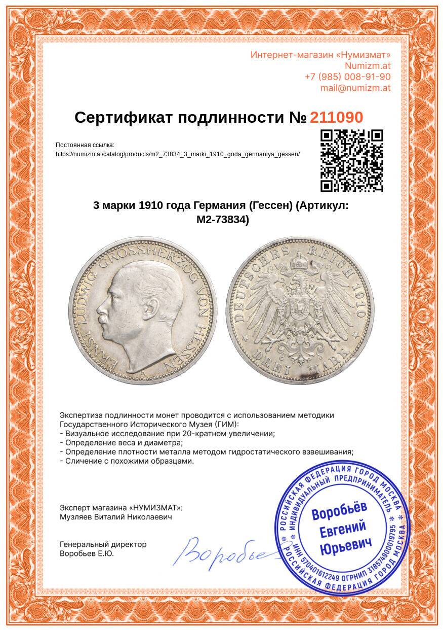 20.01.2025Интернет магазин «Нумизмат» предлагает приобрести 3 марки 1910 года Германия (Гессен).