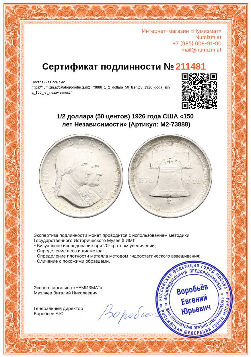 Купить 1/2 доллара (50 центов) 1926 года США «150 лет Независимости» по привлекательной цене можно в нашем интернет-магазине — Вам достаточно оформить заказ на сайте. Все монеты, представленные в каталоге, находятся в наличии на нашем складе.