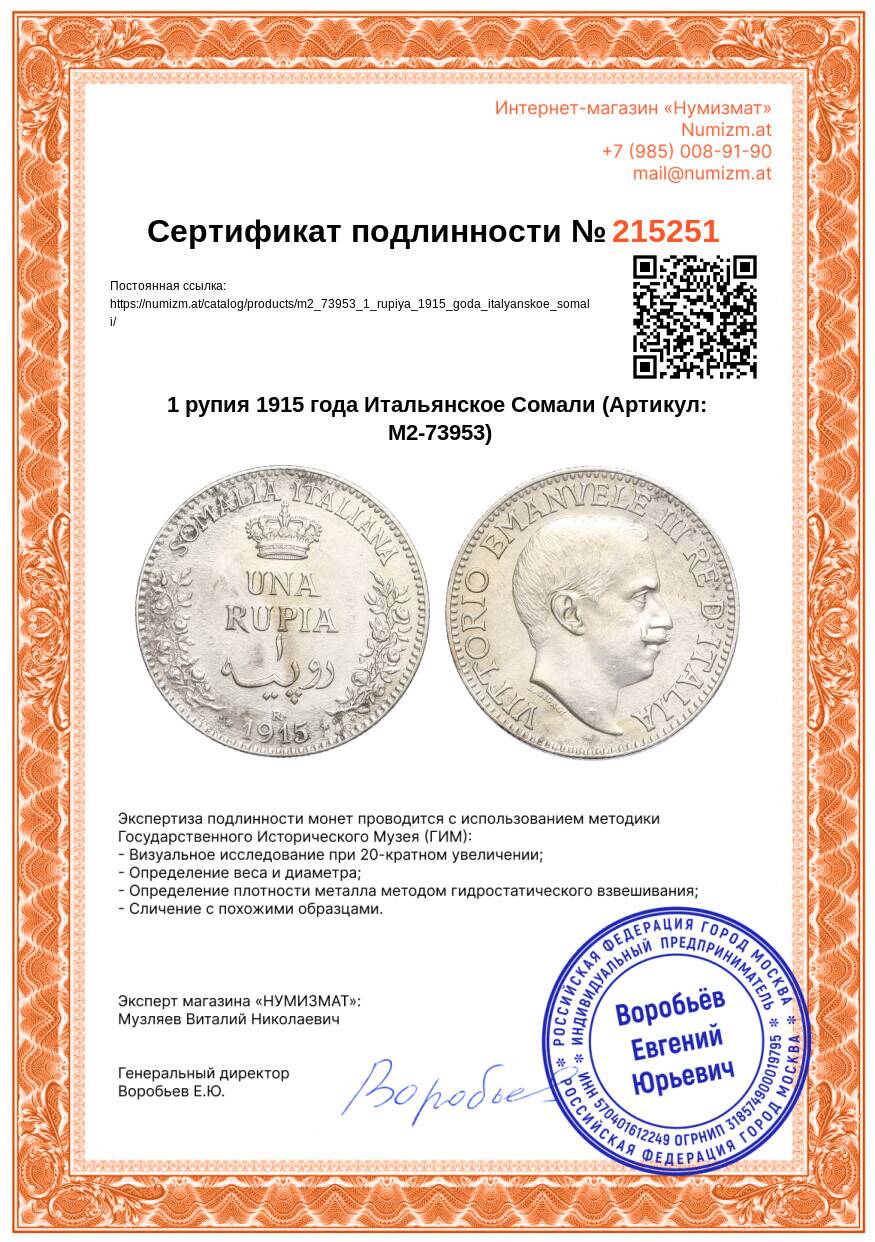 20.01.2025Интернет магазин «Нумизмат» предлагает приобрести 1 рупия 1915 года Итальянское Сомали.