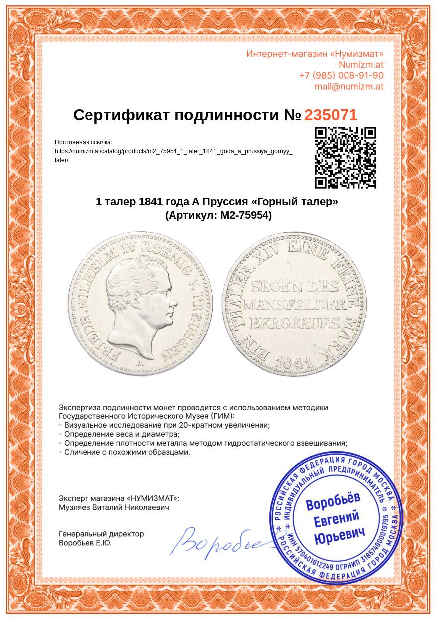 20.01.2025Интернет магазин «Нумизмат» предлагает приобрести 1 талер 1841 года A Пруссия «Горный талер».
