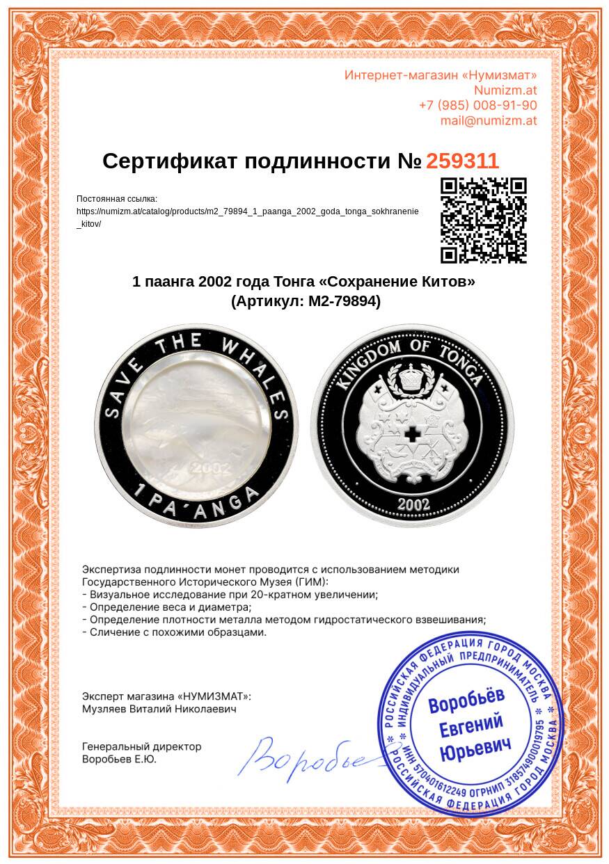 20.01.2025Интернет магазин «Нумизмат» предлагает приобрести 1 паанга 2002 года Тонга «Сохранение Китов».