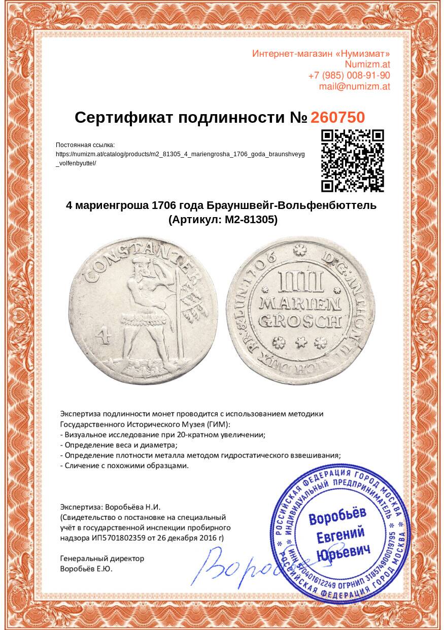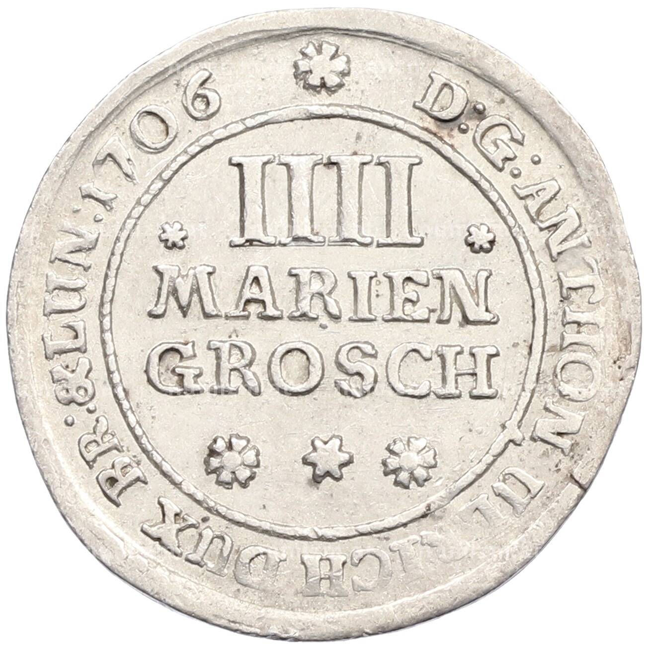 Купить 4 мариенгроша 1706 года Брауншвейг-Вольфенбюттель по привлекательной цене можно в нашем интернет-магазине — Вам достаточно оформить заказ на сайте. Все монеты, представленные в каталоге, находятся в наличии на нашем складе.