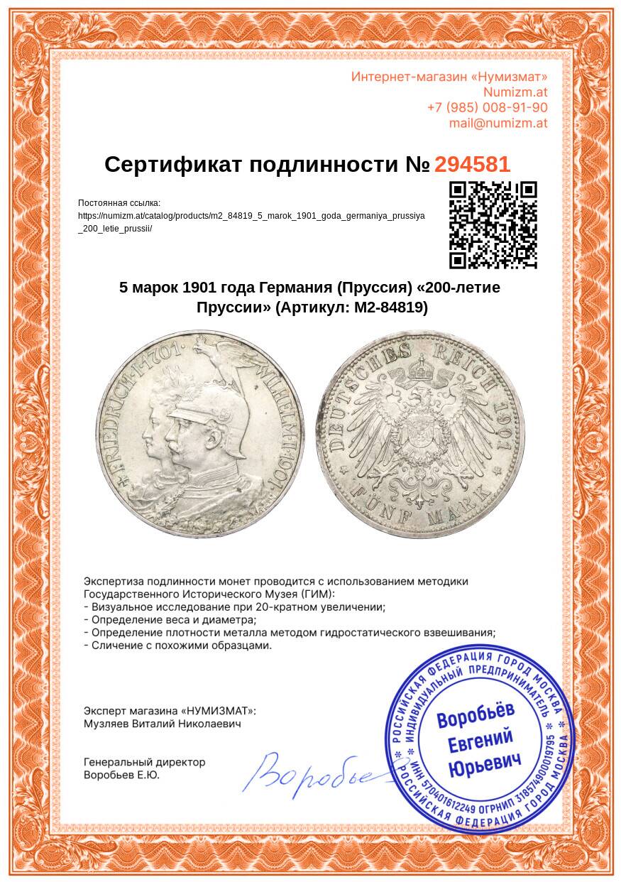 Монета 5 марок 1901 года Германия (Пруссия) «200-летие Пруссии» (Артикул: M2-84819): подробные характеристики, качественные фотографии в высоком разрешении, низкая цена.