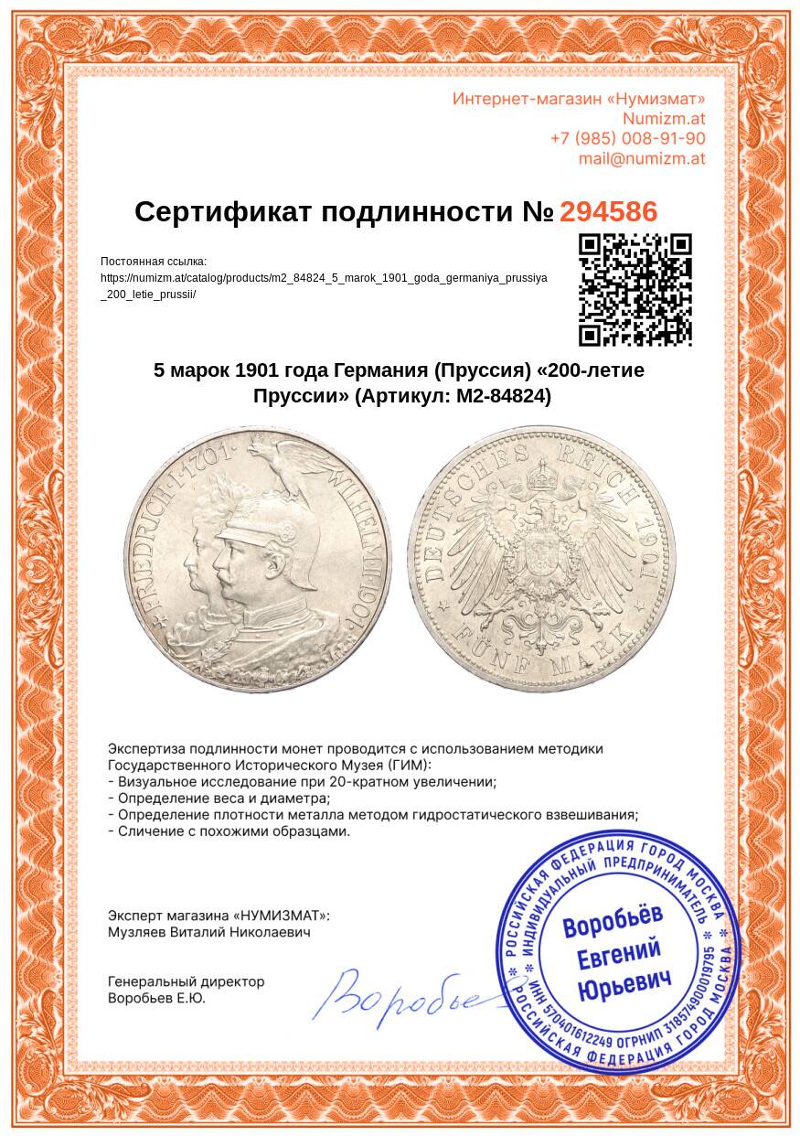 Монета 5 марок 1901 года Германия (Пруссия) «200-летие Пруссии» (Артикул: M2-84824): подробные характеристики, качественные фотографии в высоком разрешении, низкая цена.