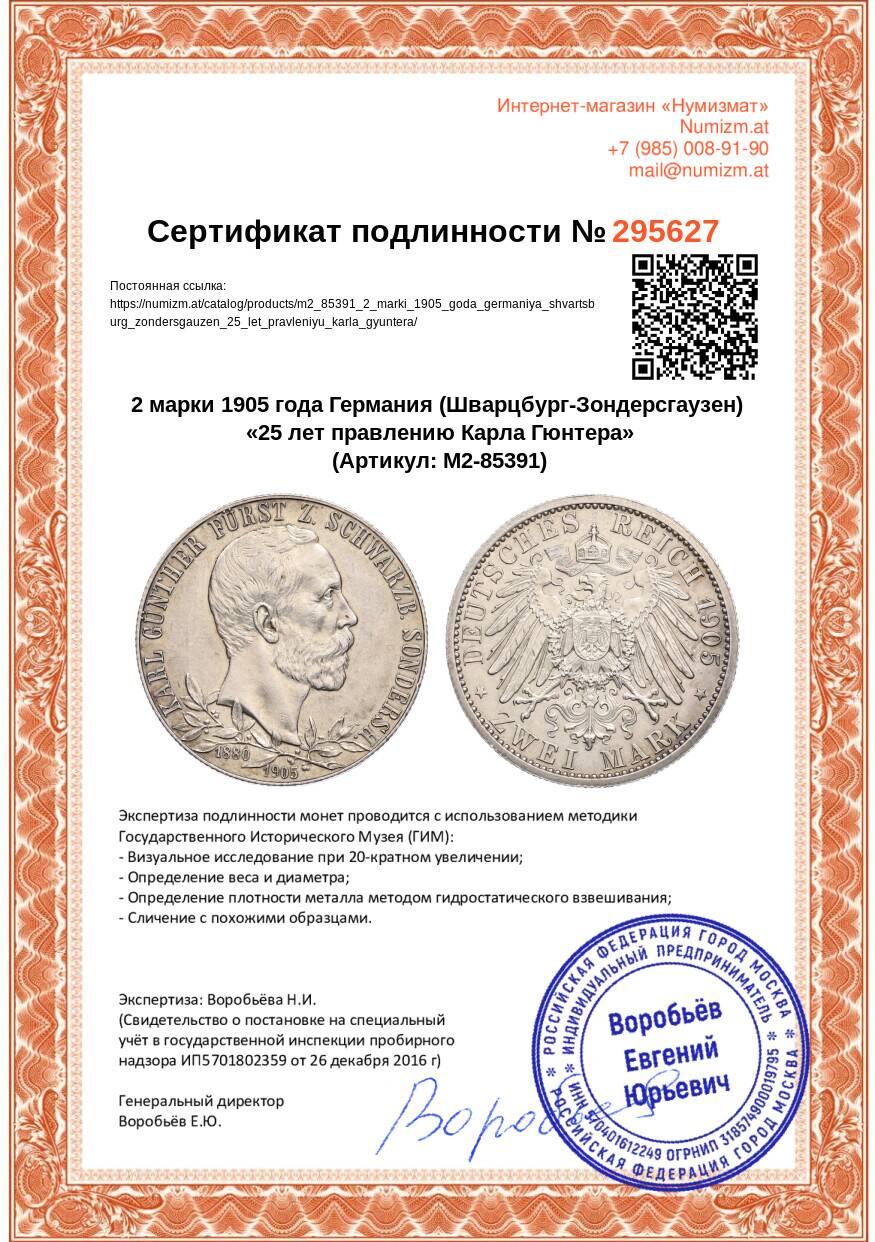 20.01.2025Интернет магазин «Нумизмат» предлагает приобрести 2 марки 1905 года Германия (Шварцбург-Зондерсгаузен) «25 лет правлению Карла Гюнтера».