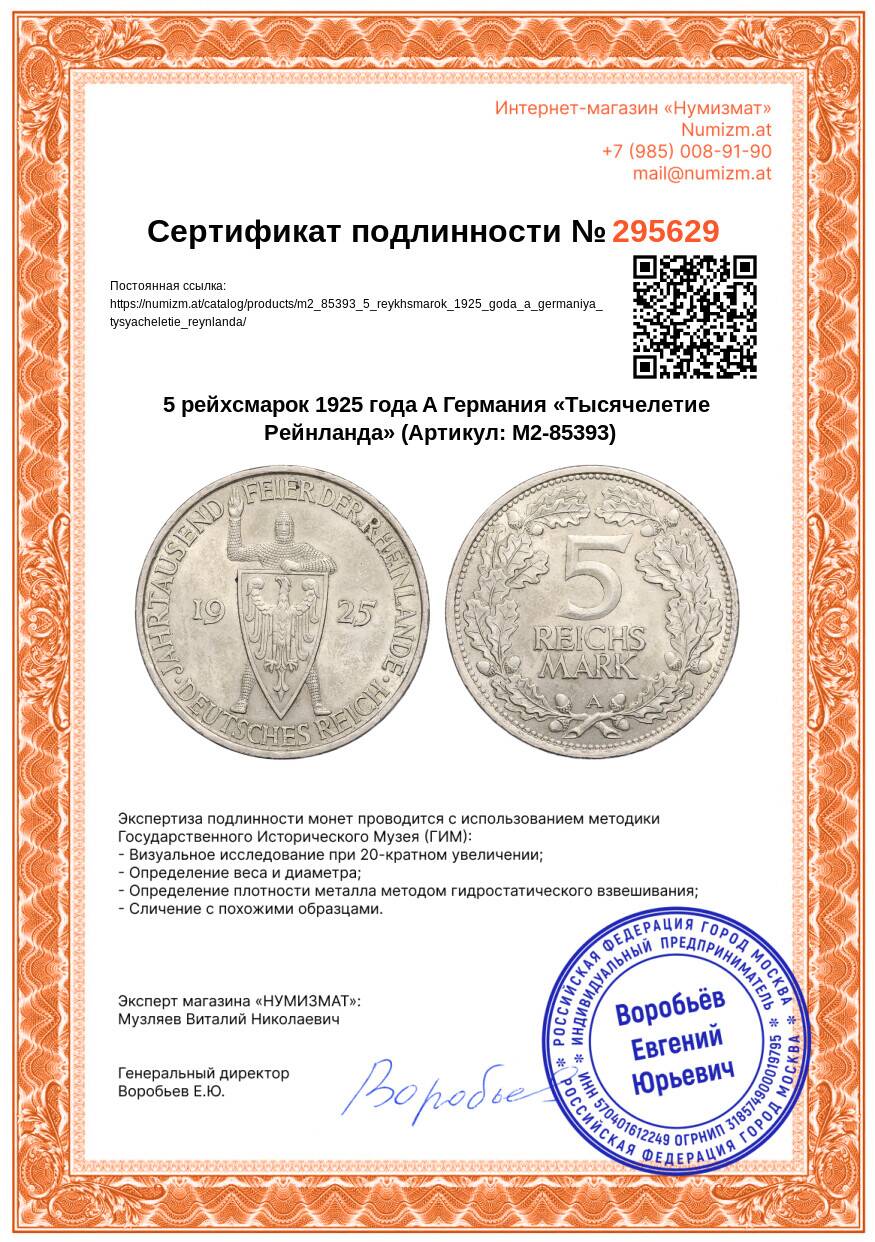 20.01.2025Интернет магазин «Нумизмат» предлагает приобрести 5 рейхсмарок 1925 года A Германия «Тысячелетие Рейнланда».