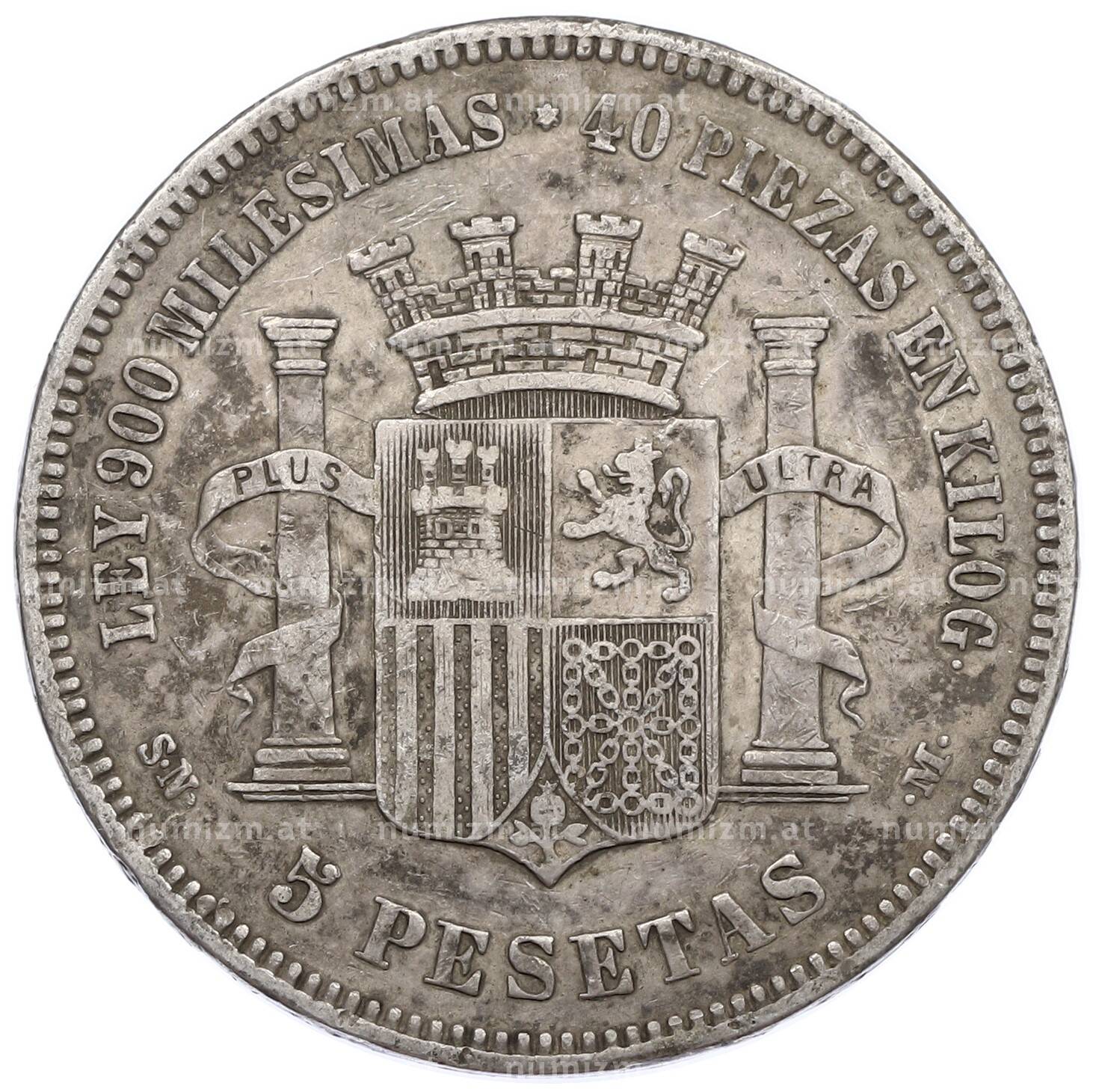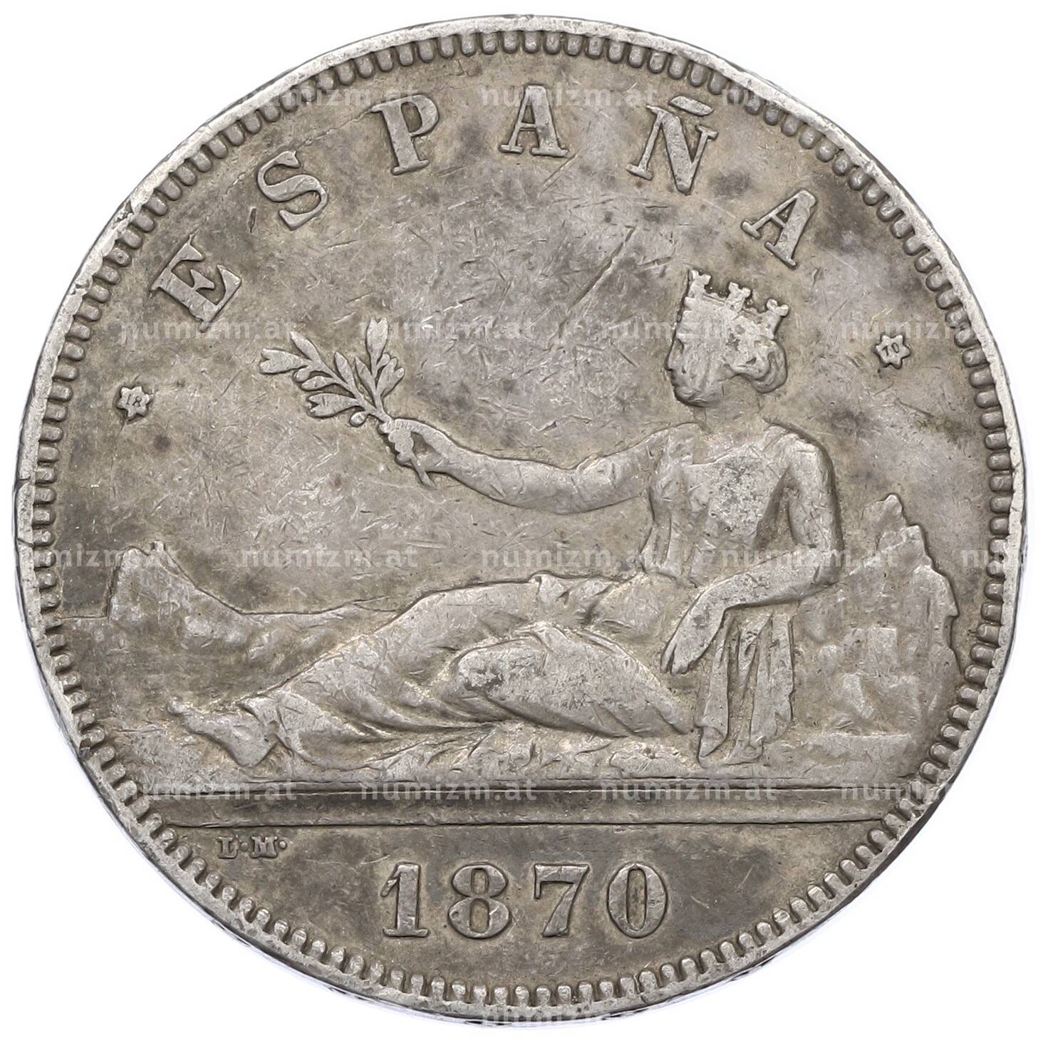 Интернет магазин «Нумизмат» предлагает приобрести 5 песет 1870 года Испания.