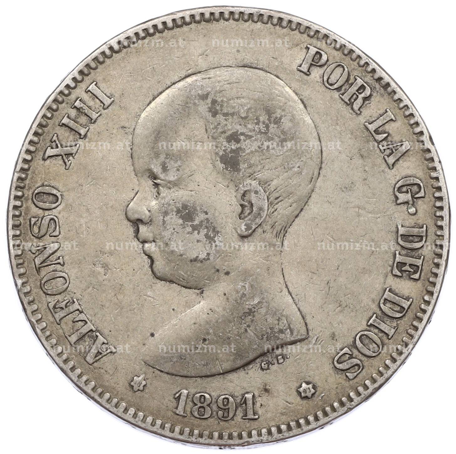Интернет магазин «Нумизмат» предлагает приобрести 5 песет 1891 года Испания.