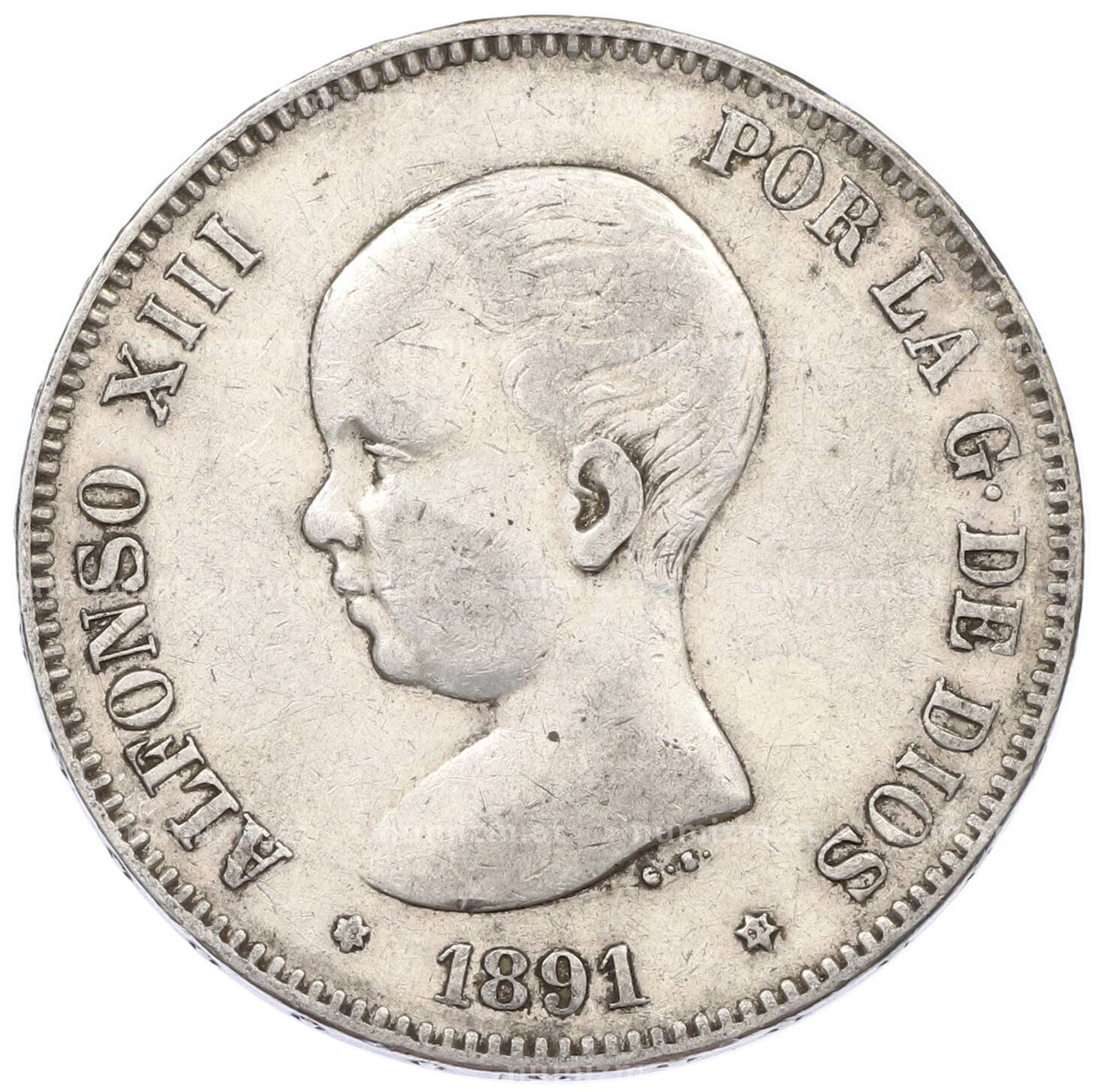 • Монета 5 песет 1891 года Испания (Артикул: M2-85955) — Фото №1 Монета 5 песет 1891 года Испания (Артикул: M2-85955) — Фото №2