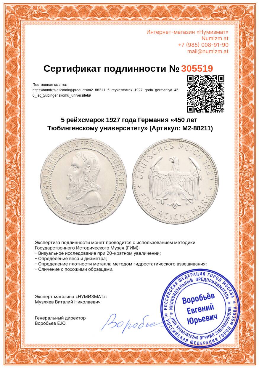 20.01.2025Интернет магазин «Нумизмат» предлагает приобрести 5 рейхсмарок 1927 года Германия «450 лет Тюбингенскому университету».